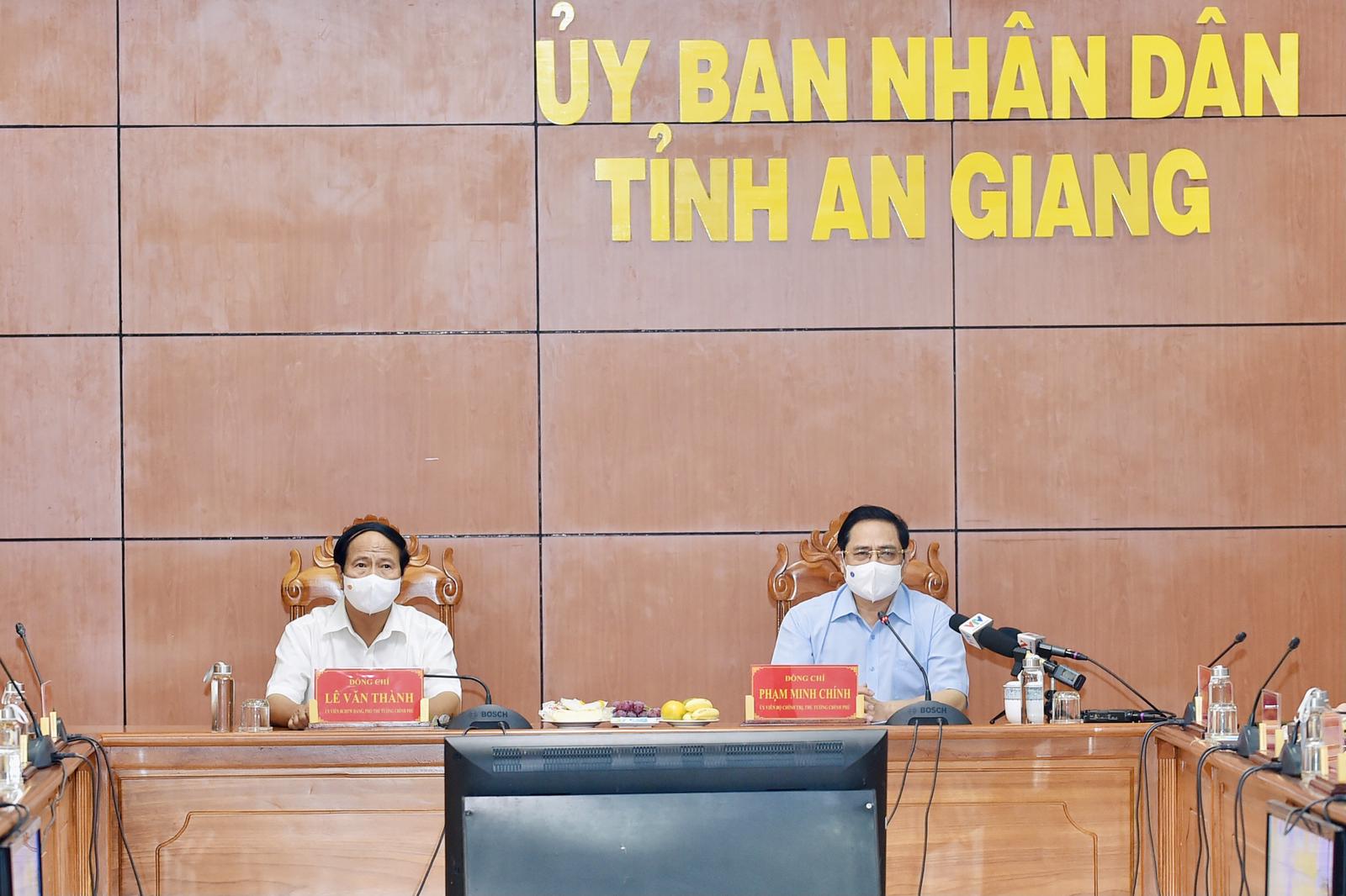 Thủ tướng Chính phủ Phạm Minh Chính và Phó Thủ tướng Lê Văn Thành ở điểm cầu An Giang. Ảnh: N.Bắc