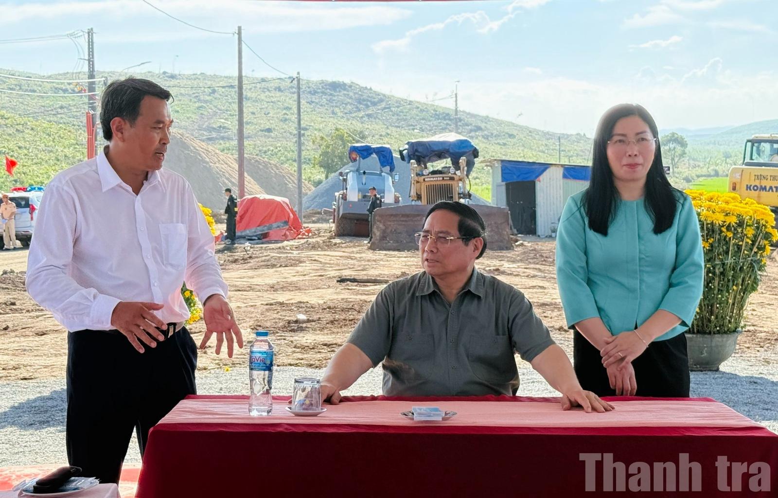 Thủ tướng Chính phủ Phạm Minh Chính lắng nghe lãnh đạo 2 xã Tuy An Nam và Tuy An Tây báo cáo với tình hình đời sống, phát triển kinh tế - xã hội của người dân tại khu tái định cư thời gian qua. Ảnh: Thủy Loan