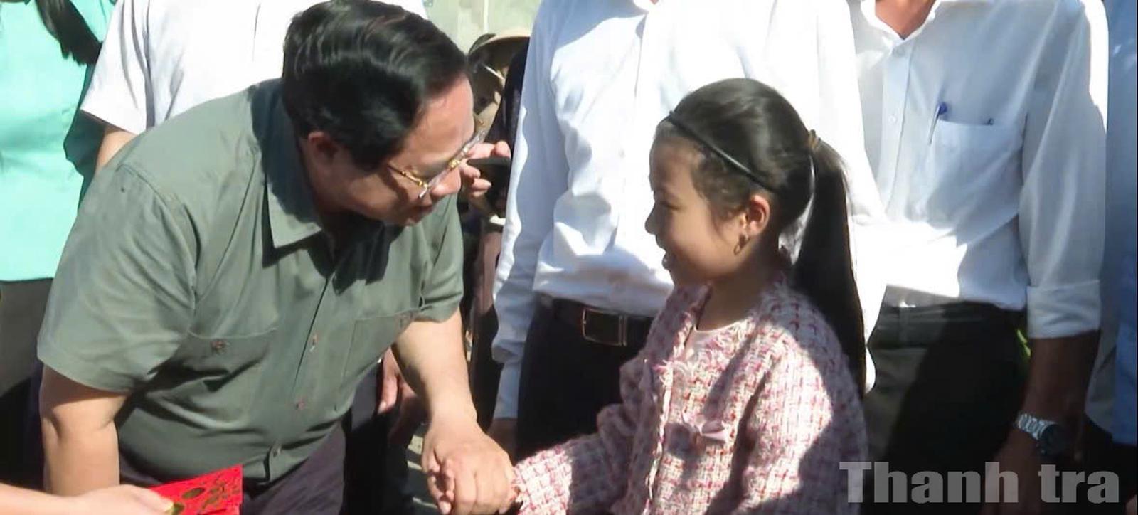 Thủ tướng Phạm Minh Chính chúc Tết, lì xì trẻ em tại Khu tái định cư Quảng Đức. Ảnh: Thủy Loan