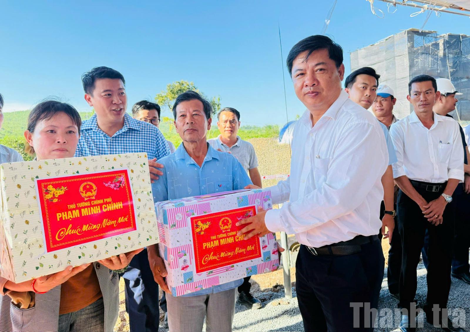 Ông Lương Nguyễn Minh Triết, Ủy viên Ban Chấp hành Trung ương Đảng, Bí thư Tỉnh ủy Đắk Lắk tặng quà cho người dân khu tái định cư. Ảnh: Thủy Loan