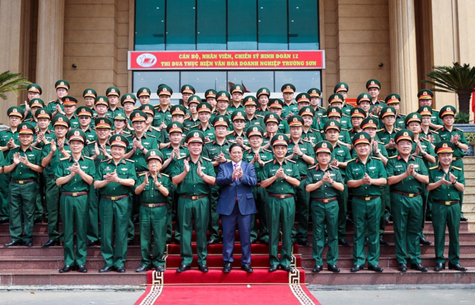 Thủ tướng đề nghị Binh đoàn 12–Tổng Công ty Xây dựng Trường Sơn thực hiện "3 tiên phong" trong thời kỳ mới: Tiên phong đổi mới sáng tạo, ứng dụng khoa học công nghệ, tăng năng suất lao động, chuyển đổi số, đào tạo nhân lực; tiên phong trong phát triển hạ tầng chiến lược, nhất là hạ tầng giao thông và nâng cao chất lượng sản phẩm; tiên phong xây dựng Đảng bộ trong sạch, vững mạnh, nâng cao năng lực lãnh đạo và sức chiến đấu của tổ chức đảng và đảng viên, tô thắm thêm truyền thống "Bộ đội Cụ Hồ".