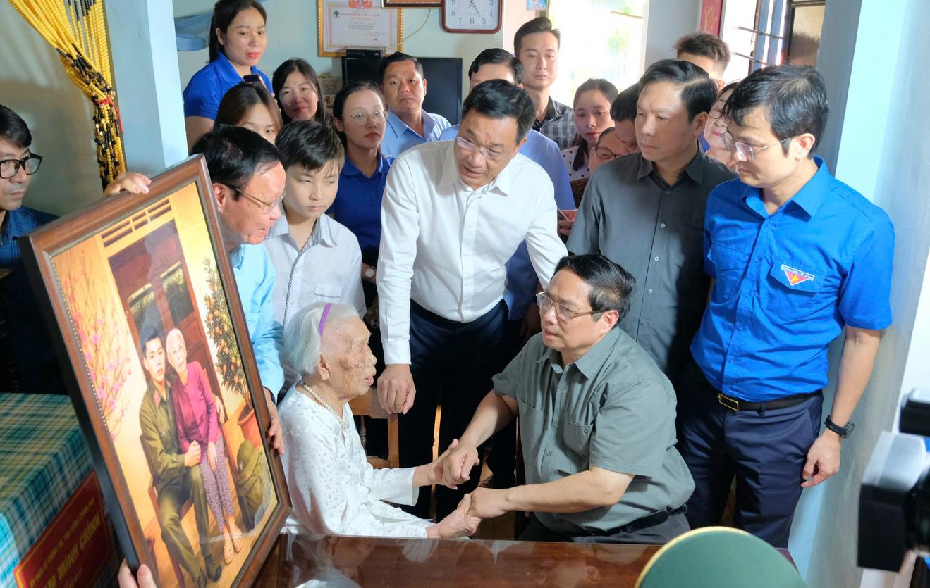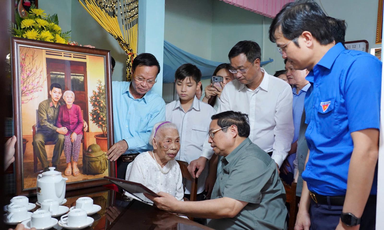 Thủ tướng Phạm Minh Chính và các thành viên Đoàn công tác của Chính phủ, lãnh đạo tỉnh Quảng Trị thăm Mẹ Việt Nam Anh hùng Đào Thị Vui. Ảnh: Minh Tân