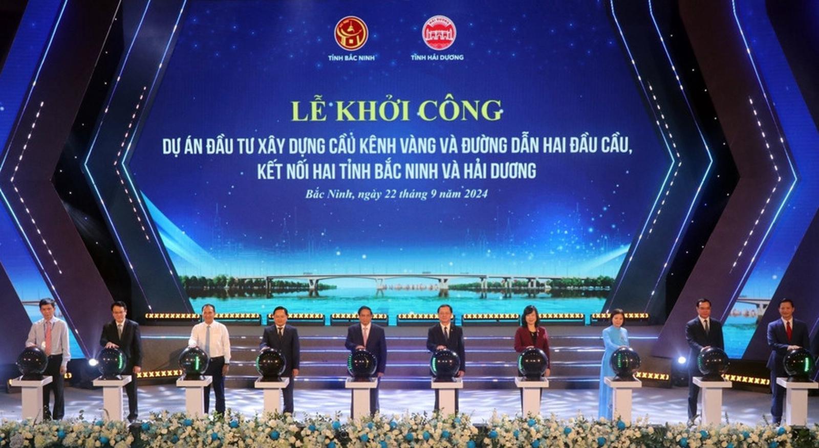 Khởi công 2 dự án nghìn tỷ Thủ tướng Phạm Minh Chính cùng lãnh đạo các bộ, ngành, tỉnh Bắc Ninh và Hải Dương thực hiện nghi thức khởi công Dự án xây dựng cầu Kênh Vàng. Ảnh: HH Trong khuôn khổ hội nghị công bố quy hoạch và xúc tiến đầu tư tỉnh Bắc Ninh năm 2024, đã diễn ra nghi thức khởi công dự án đầu tư xây dựng cầu Kênh Vàng, kết nối hai tỉnh Bắc Ninh - Hải Dương. Nghi lễ tổ chức khởi công được chuyển từ hình thức trực tiếp sang hình thức online. Toàn bộ kinh phí để khởi công trực tiếp đã được dành để ủng hộ đồng bào bị thiệt hại sau cơn bão số 3. Dự án xây dựng cầu Kênh Vàng và đường dẫn hai đầu cầu, kết nối hai tỉnh Bắc Ninh và Hải Dương có chiều dài tuyến khoảng 13,4km, có tổng kinh phí hơn 2.182 tỷ đồng. Vị trí xây dựng tại huyện Gia Bình, huyện Lương Tài của tỉnh Bắc Ninh và huyện Nam Sách, tỉnh Hải Dương. Dự kiến, cây cầu được hợp long vào năm 2025 và hoàn thành toàn bộ dự án vào dịp kỷ niệm 30 năm tái lập tỉnh Bắc Ninh (1/1/1997-1/1/2027). Cũng tại hội nghị, tỉnh Bắc Ninh đã nhấn nút khởi công dự án khu nhà ở xã hội thuộc dự án đầu tư xây dựng hạ tầng kỹ thuật khu đô thị mới Quế Võ, với tổng vốn đầu tư hơn 1.323 tỷ đồng. Dự án gồm 4 tòa nhà ở xã hội, mỗi tòa 12 tầng, tổng diện tích xây dựng hơn 100.000 m2 sàn. Dự kiến hoàn thành và đưa vào sử dụng vào cuối năm 2025, dự án sẽ cung cấp 914 căn hộ, đáp ứng nhu cầu ở cho khoảng 3.000 người lao động có nhu cầu về nhà ở xã hội.