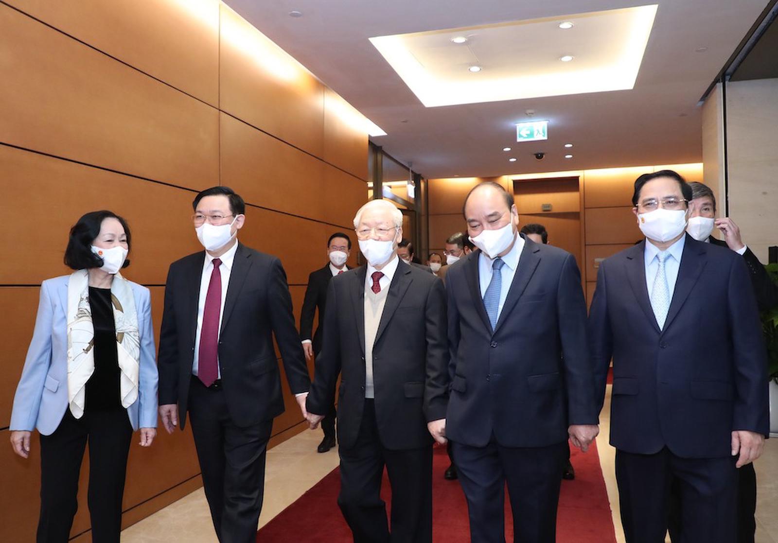 Tổng Bí thư Nguyễn Phú Trọng, Chủ tịch nước Nguyễn Xuân Phúc, Thủ tướng Phạm Minh Chính, Chủ tịch Quốc hội Vương Đình Huệ, Trưởng ban Tổ chức Trung ương Trương Thị Mai tới dự hội nghị. Ảnh: Đ.X