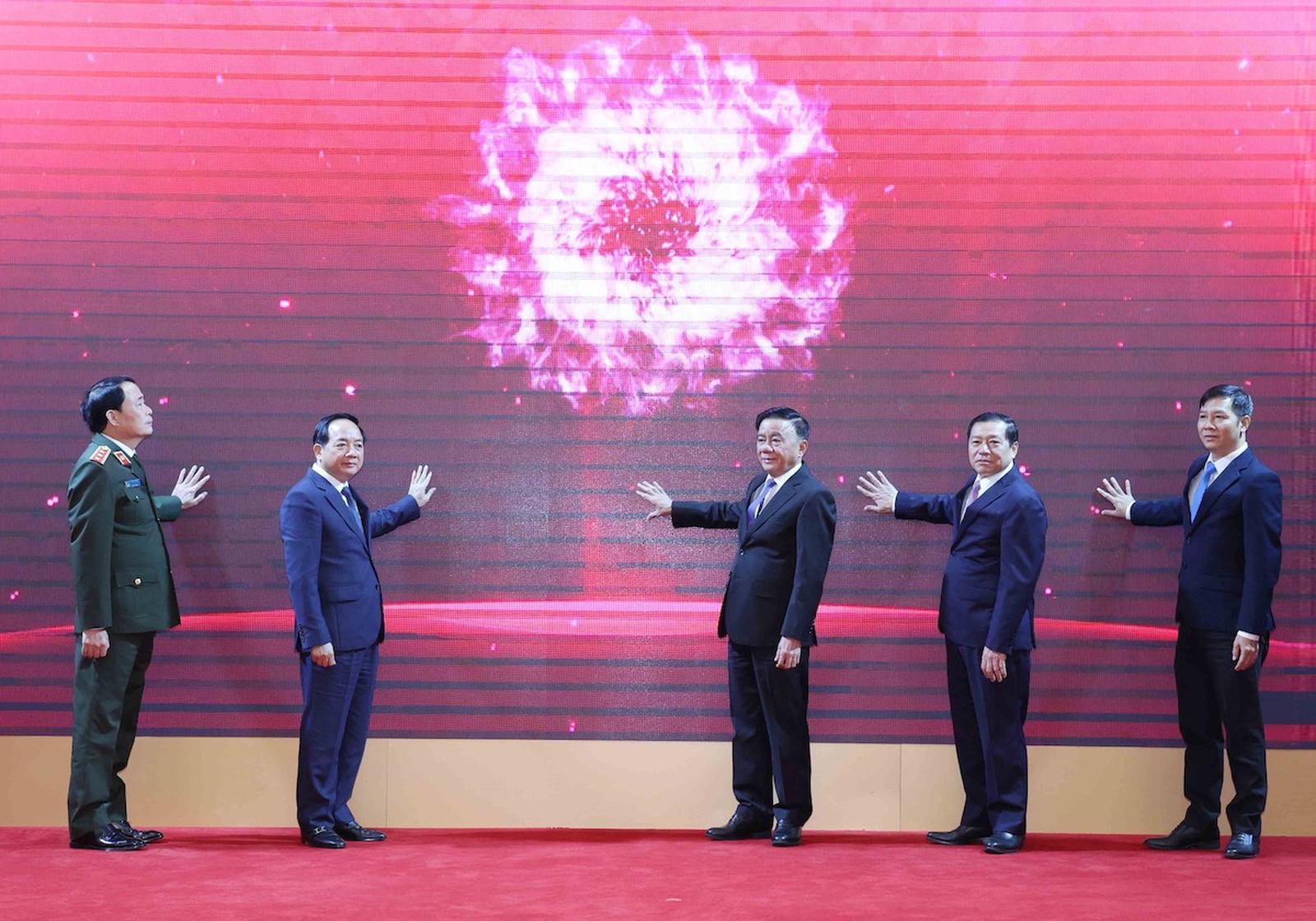 Thường trực Ban Bí thư Trần Cẩm Tú, Trưởng Ban Tuyên giáo và Dân vận Trung ương Trịnh Văn Quyết cùng lãnh đạo một số bộ, ngành thực hiện nghi thức ra mắt ứng dụng. Ảnh: TTXVN