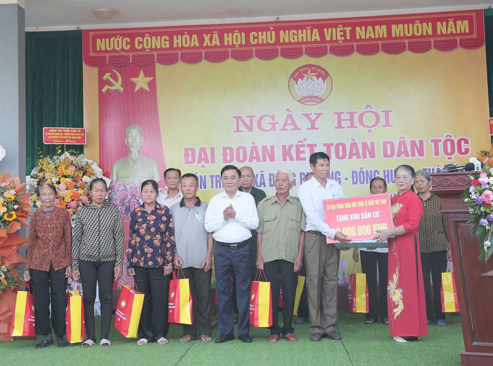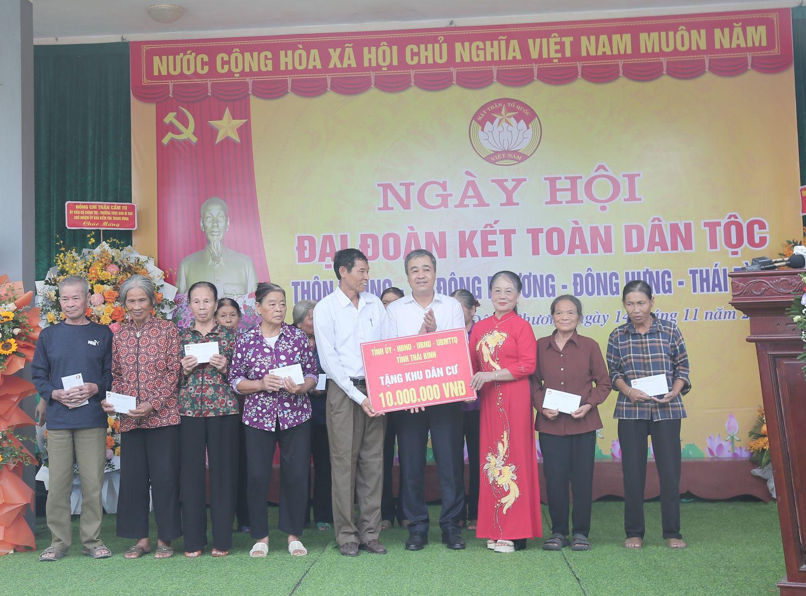 Nhân dịp này, Thường trực Ban Bí thư, Chủ nhiệm Ủy ban Kiểm tra Trung ương Trần Cẩm Tú và lãnh đạo tỉnh Thái Bình, huyện Đông Hưng đã tặng quà cho khu dân cư, hộ gia đình chính sách, hộ nghèo, hộ có hoàn cảnh khó khăn xã Đông Phương.