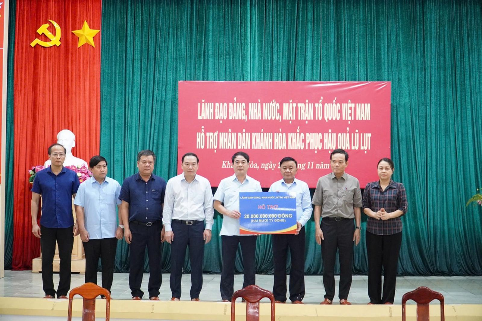 Thay mặt lãnh đạo Đảng, Nhà nước, Thường trực Ban Bí thư Trần Cẩm Tú trao hỗ trợ Đảng bộ, chính quyền và Nhân dân tỉnh Khánh Hòa số tiền 20 tỷ đồng. Bên cạnh đó, TP HCM chuyển cho tỉnh Khánh Hòa số tiền 50 tỷ đồng.