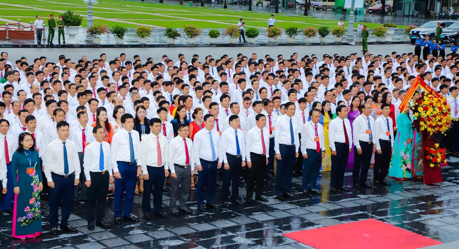 Lãnh đạo tỉnh Nghệ An cùng đoàn đại biểu dâng hoa tưởng niệm Chủ tịch Hồ Chí Minh tại Tượng đài Bác Hồ vào sáng 4/8. Ảnh: Phạm Bằng