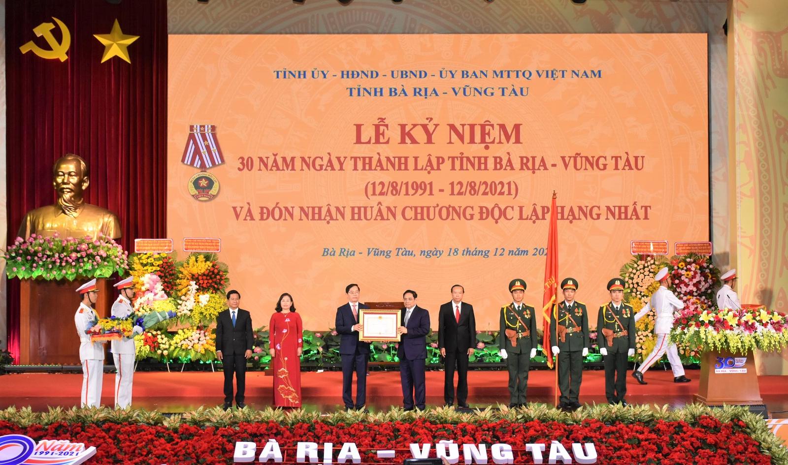 Thủ tướng Chính phủ Phạm Minh Chính trao Huân chương Độc lập hạng Nhất cho Đảng bộ, chính quyền và nhân dân tỉnh BRVT. Ảnh: BTC