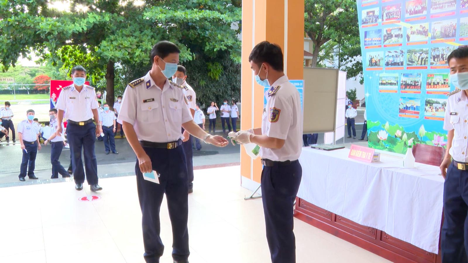 Cán bộ, chiến sĩ Vùng Cảnh sát biển 3 tiến hành đo thân nhiệt, sát khuẩn tay trước khi vào làm thủ tục thực hiện bầu cử. (Ảnh: CTV)
