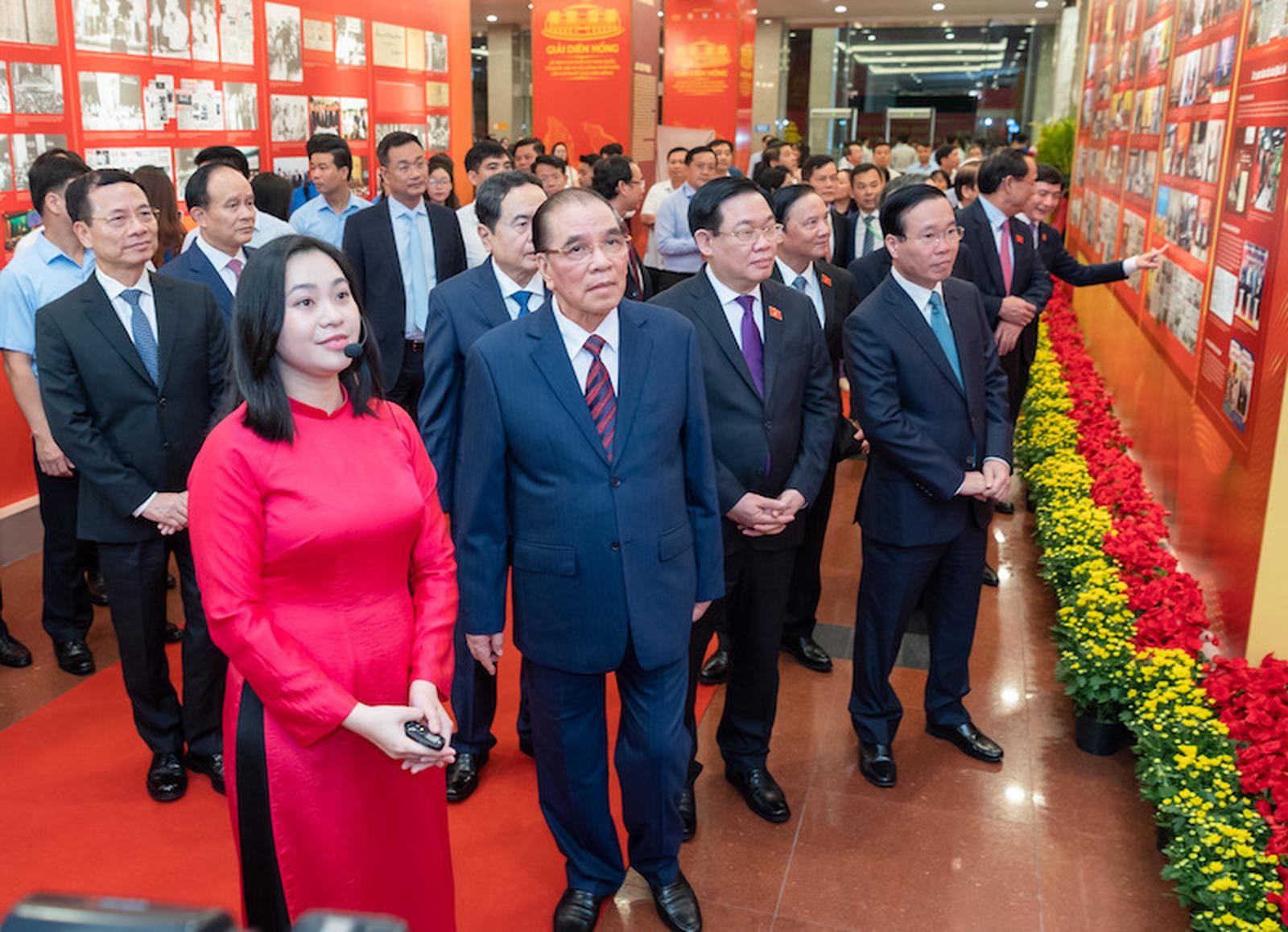 Nguyên Tổng Bí thư Nông Đức Mạnh, Chủ tịch nước Võ Văn Thưởng, Chủ tịch Quốc hội Vương Đình Huệ tham quan triển lãm ảnh về báo chí với hoạt động của Quốc hội tại lễ trao Giải Diên Hồng. Ảnh: Đ.X