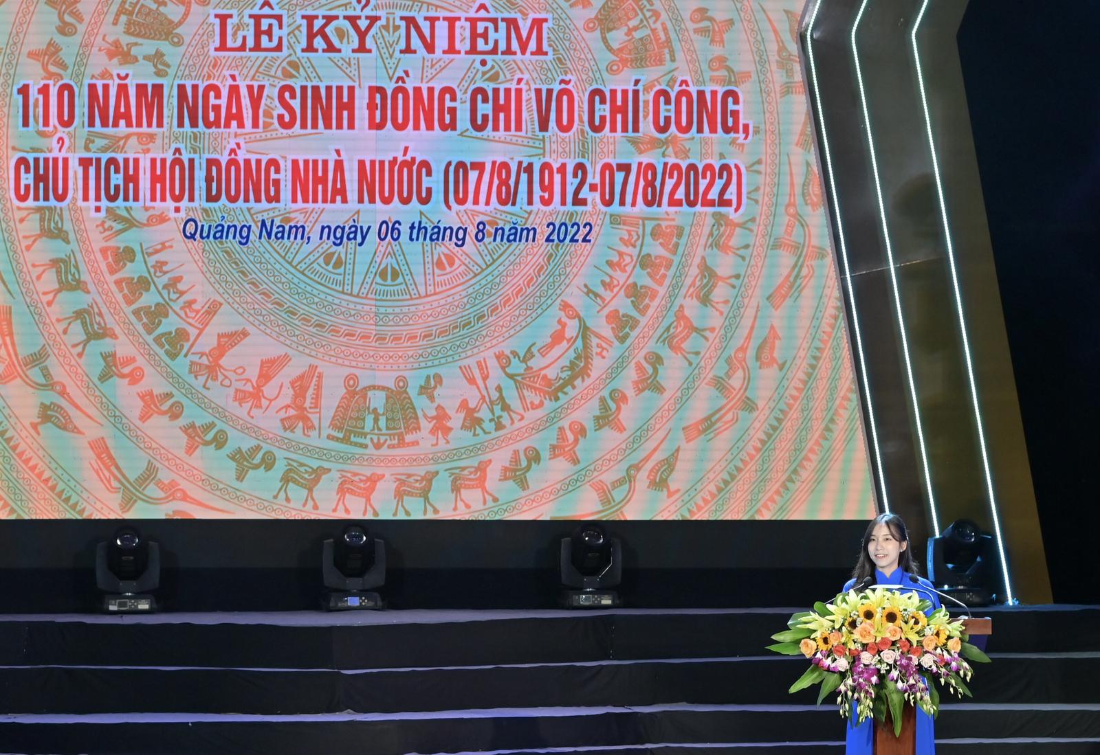 Chị Phan Vũ Thùy Trân, đại diện cho thế hệ trẻ tỉnh Quảng Nam phát biểu tại lễ kỷ niệm. Ảnh: P.B
