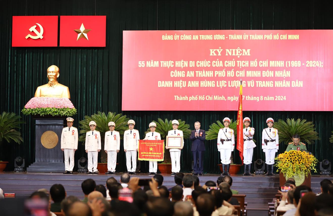 (Thanh tra) - Sáng ngày 17/8/2024, Đảng ủy Công an Trung ương và Thành ủy Thành phố Hồ Chí Minh đã tổ chức Lễ kỷ niệm 55 năm thực hiện Di chúc của Chủ tịch Hồ Chí Minh (1969-2024); Công an Thành phố Hồ Chí Minh đón nhận danh hiệu Anh hùng Lực lượng vũ trang nhân dân. Tổng Bí thư, Chủ tịch nước Tô Lâm đến dự và chỉ đạo.