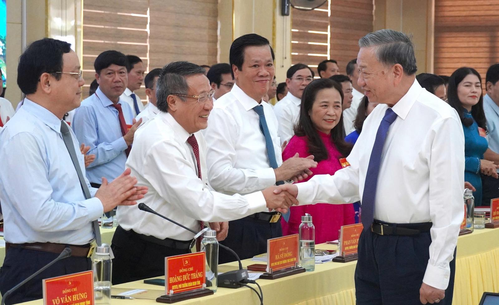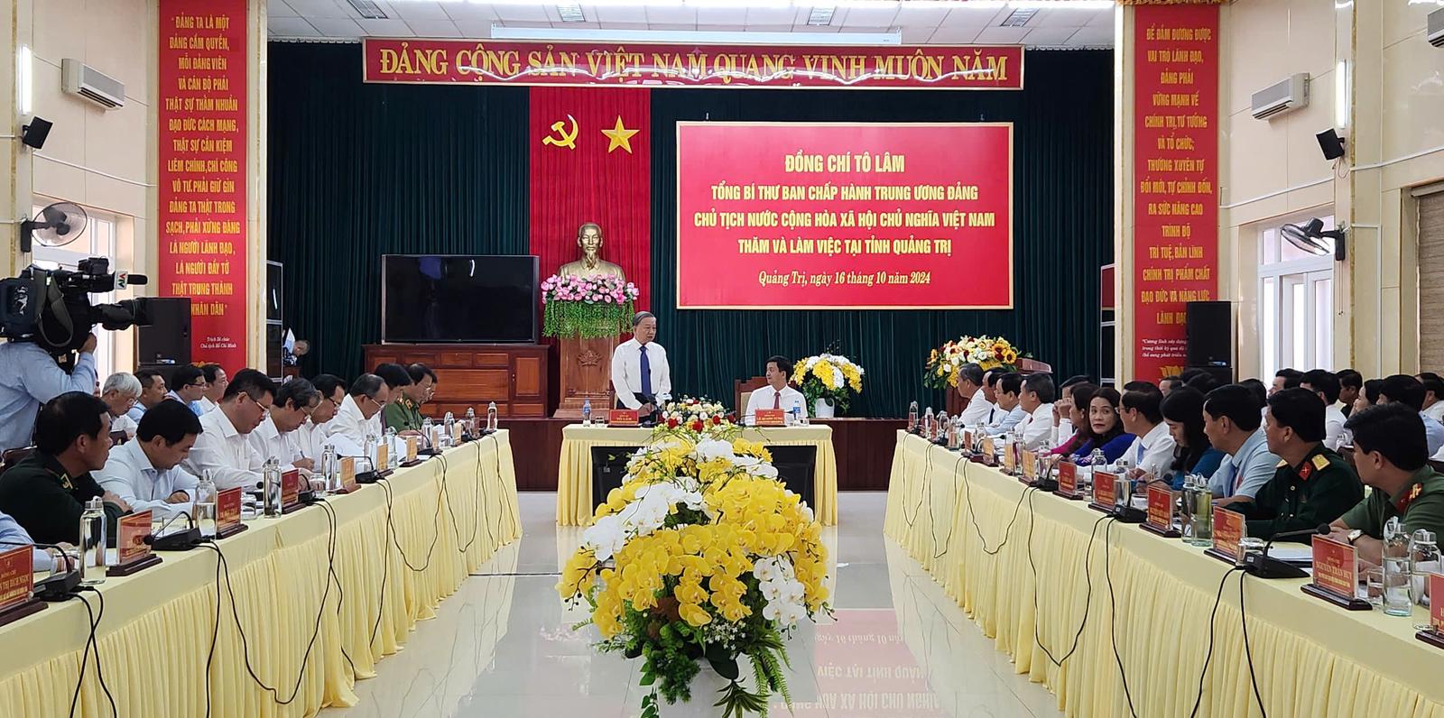 Tổng Bí thư, Chủ tịch nước Tô Lâm bày tỏ với tấm lòng trân trọng đối với quê hương Quảng Trị anh hùng, tình cảm yêu mến đối với đồng bào, đồng chí, Tổng Bí thư, Chủ tịch nước mong muốn Đảng bộ, chính quyền và Nhân dân Quảng Trị giữ vững và phát huy tinh thần đoàn kết, tiếp tục phát huy truyền thống anh hùng cách mạng, ý chí kiên cường, chủ động, sáng tạo cùng với thời cơ, vận hội mới, khắc phục mọi khó khăn, gian khổ, vượt qua thách thức, tạo bứt phá mới trong phát triển kinh tế-xã hội, thực hiện thắng lợi các mục tiêu, nhiệm vụ mà Nghị quyết Đại hội Đảng bộ tỉnh lần thứ XVII nhiệm kỳ 2020-2025 đã đề ra.