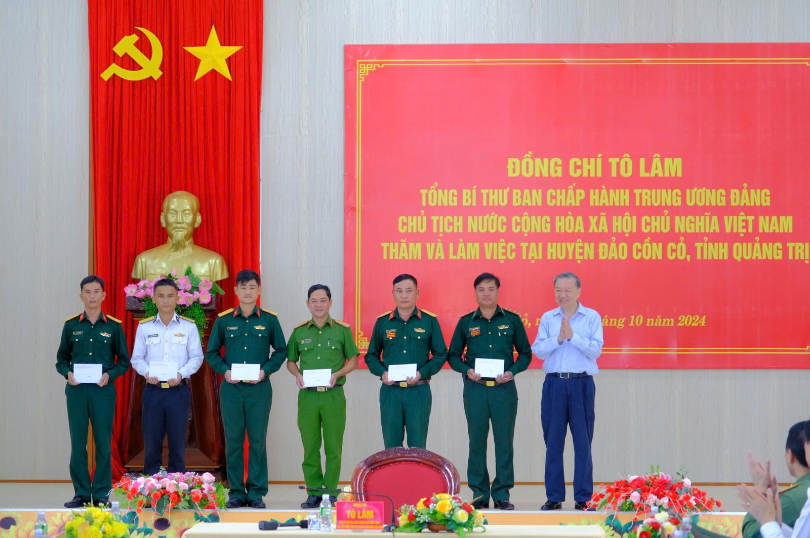 Tổng Bí thư, Chủ tịch nước Tô Lâm tặng quà động viên các lực lượng vũ trang huyện đảo Cồn Cỏ trong chuyến thăm, làm việc tại đây. Ảnh: Minh Tân