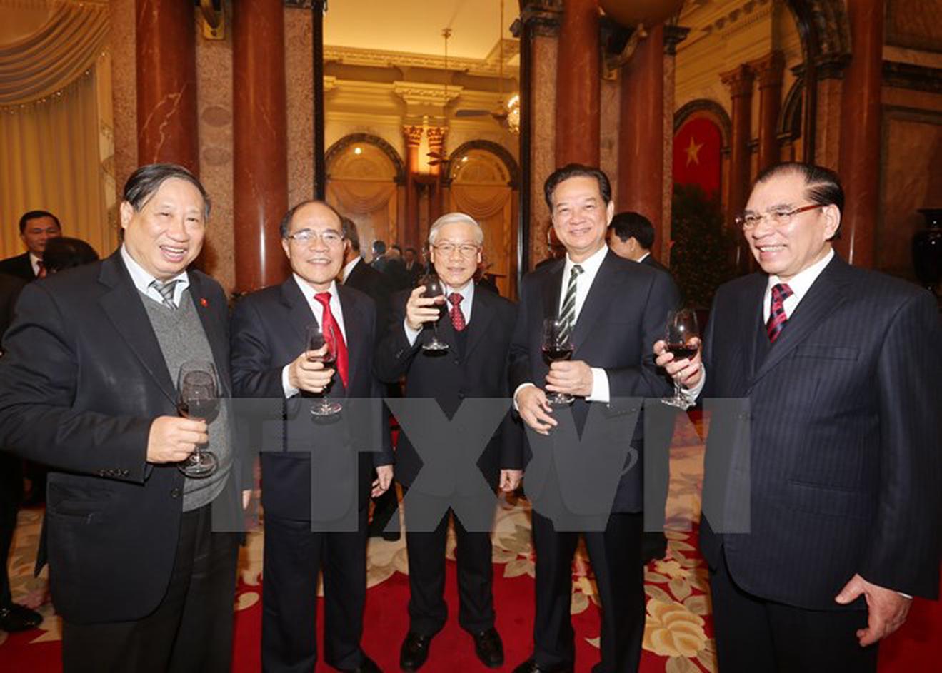 Tổng Bí thư cùng các vị lão thành cách mạng, lãnh đạo, nguyên lãnh đạo Đảng, Nhà nước nâng ly mừng Đảng, mừng Xuân. (Ảnh: Trí Dũng/TTXVN)