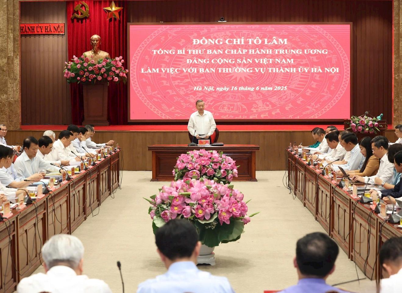 Phát biểu mở đầu, Tổng Bí thư Tô Lâm nhấn mạnh, Hà Nội - Thủ đô ngàn năm văn hiến, trung tâm đầu não chính trị - hành chính Quốc gia cần phải rà soát, đánh giá toàn diện tình hình phát triển kinh tế - xã hội, khơi dậy mạnh mẽ tiềm năng, lợi thế, từ đó đề ra những đột phá chiến lược mới, tạo bước chuyển căn cơ để Hà Nội thực sự bứt phá, vươn lên giữ vai trò dẫn dắt trong sự nghiệp phát triển chung của đất nước.