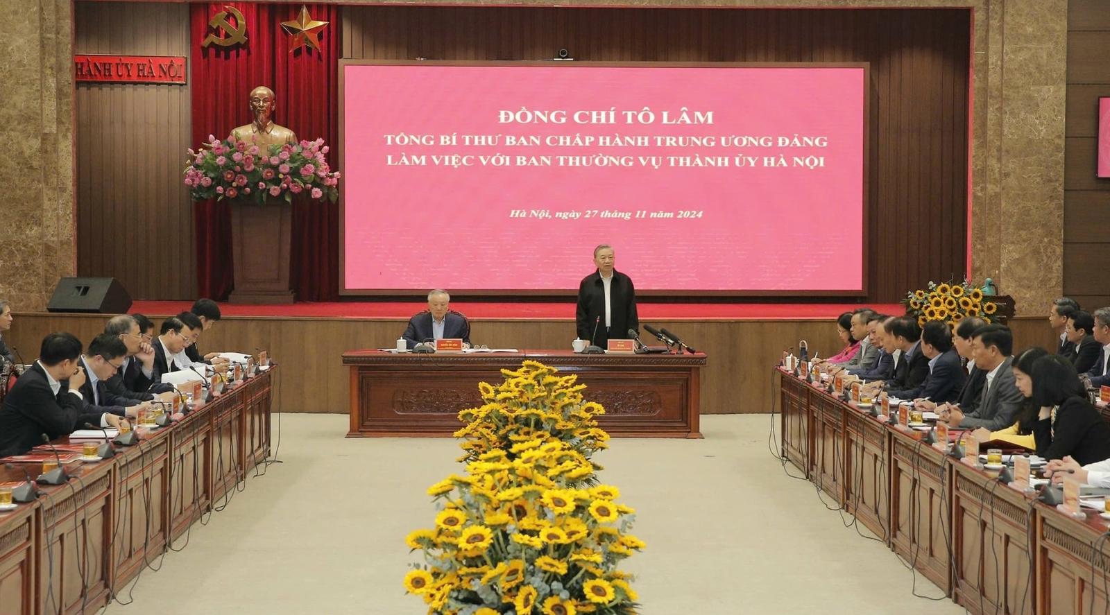 Ngày 27/11, Tổng Bí thư Tô Lâm đã thăm và làm việc với Ban Thường vụ Thành ủy Hà Nội để nghe báo cáo kết quả công tác xây dựng Đảng, xây dựng hệ thống chính trị, phát triển kinh tế - xã hội, quốc phòng - an ninh, đối ngoại của thành phố năm 2024 và kế hoạch năm 2025, giai đoạn 2025-2030.