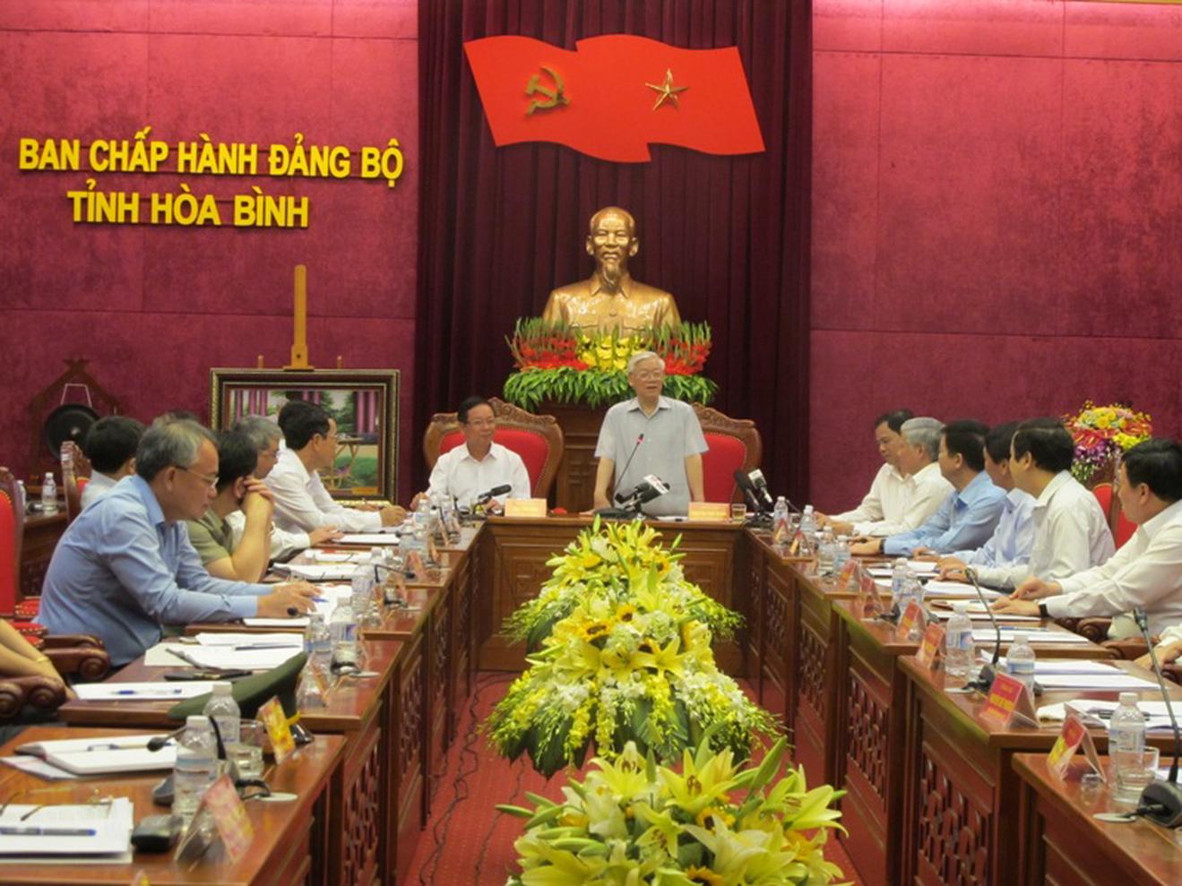 Phát biểu với lãnh đạo chủ chốt tỉnh, Tổng Bí thư Nguyễn Phú Trọng, chỉ rõ: Hòa Bình là tỉnh miền núi, cửa ngõ của vùng Tây Bắc, có nhiều tiềm năng, lợi thế. Nhân dân tỉnh Hòa Bình giàu truyền thống cách mạng, có tinh thần đoàn kết, cần cù, năng động, có nền văn hóa giàu bản sắc dân tộc.