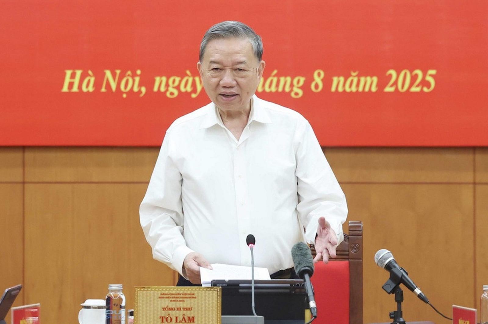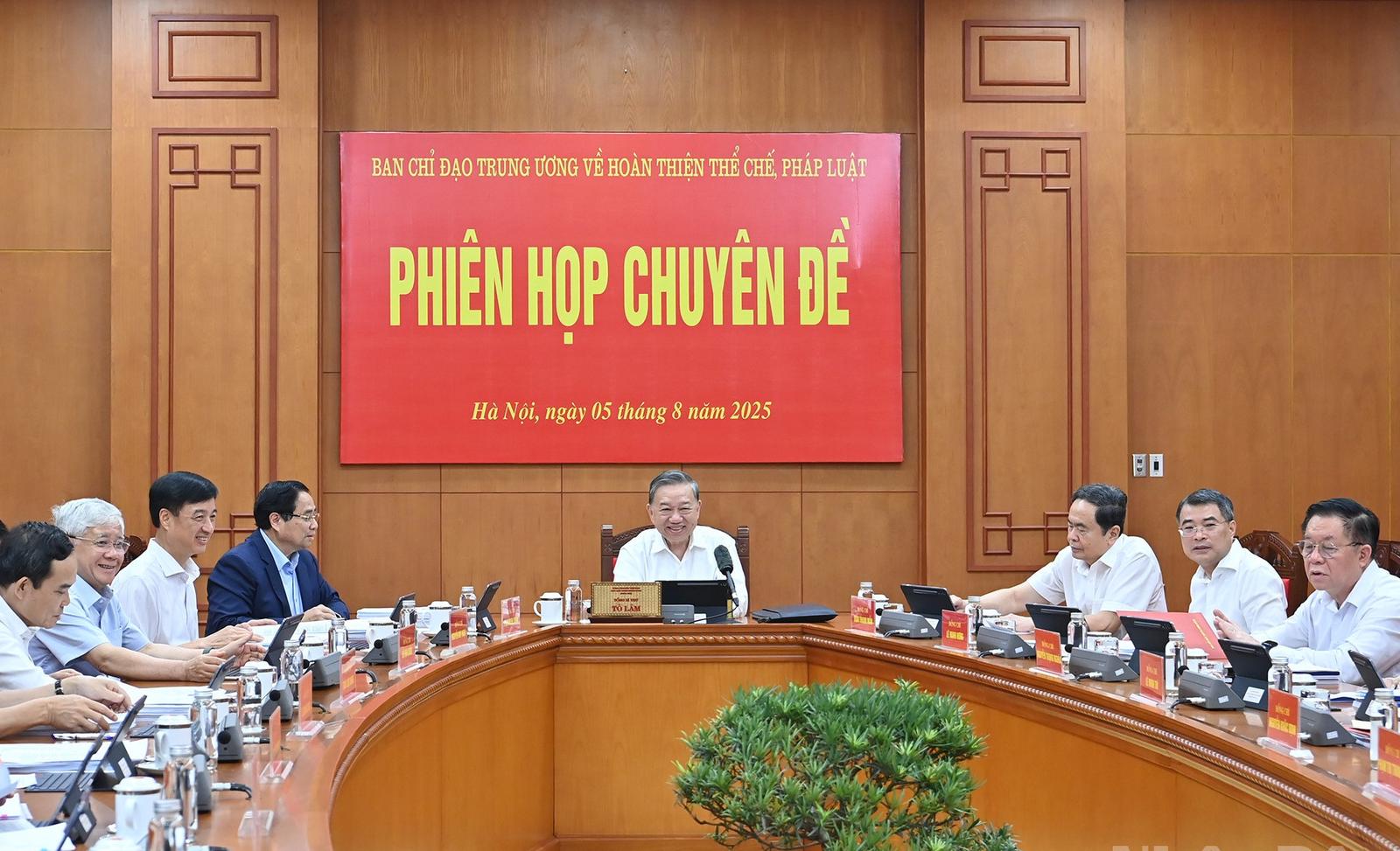 Chiều 5/8, Tổng Bí thư Tô Lâm, Trưởng Ban Chỉ đạo Trung ương về hoàn thiện thể chế, pháp luật (Ban Chỉ đạo), chủ trì phiên họp thứ nhất, cho ý kiến một số vấn đề để tiếp tục thực hiện Nghị quyết số 66 của Bộ Chính trị về đổi mới công tác xây dựng và thi hành pháp luật đáp ứng yêu cầu phát triển đất nước trong kỷ nguyên mới.