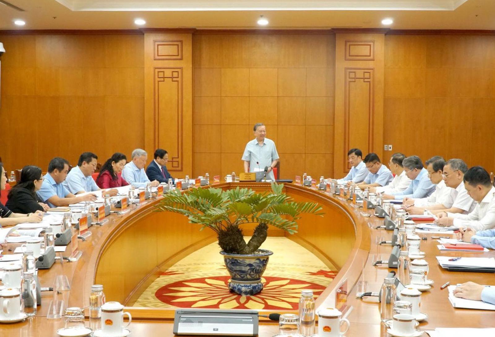 Tổng Bí thư Tô Lâm chủ trì buổi làm việc với Ban Thường vụ Đảng ủy Chính phủ về một số nội dung của 4 dự án Luật: Luật Đất đai (sửa đổi); Luật Quy hoạch; Luật Quy hoạch đô thị và nông thôn; Luật Đầu tư. Ảnh: Cổng TTĐT Đảng Cộng sản