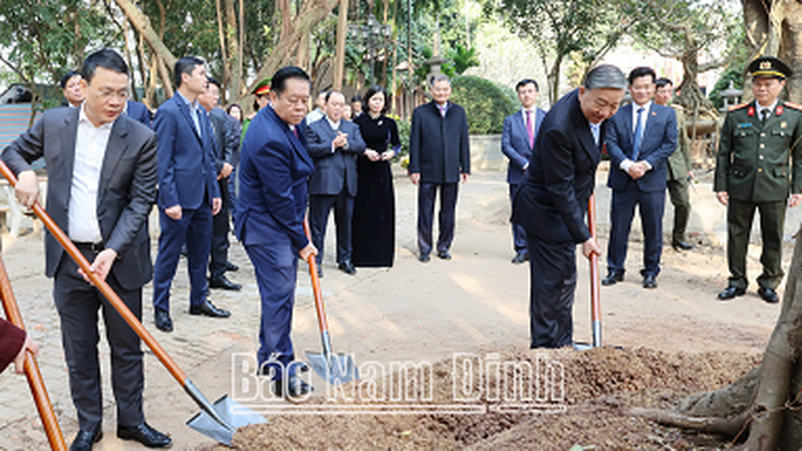 Đồng chí Tổng Bí thư Tô Lâm cùng các đồng chí lãnh đạo Đảng, Nhà nước, lãnh đạo tỉnh Nam Định trồng cây lưu niệm tại khuôn viên Khu Di tích Đền Trần. Ảnh: BNĐ
