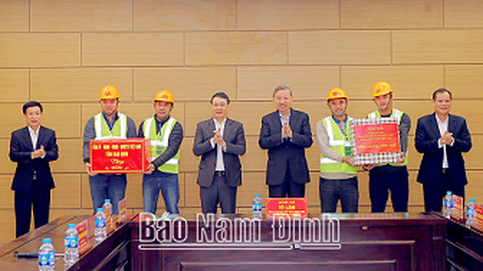 Tổng Bí thư Tô Lâm, các đồng chí lãnh đạo tỉnh tặng quà cán bộ, công nhân thi công công trình Bệnh viện Đa khoa tỉnh Nam Định. Ảnh: BNĐ