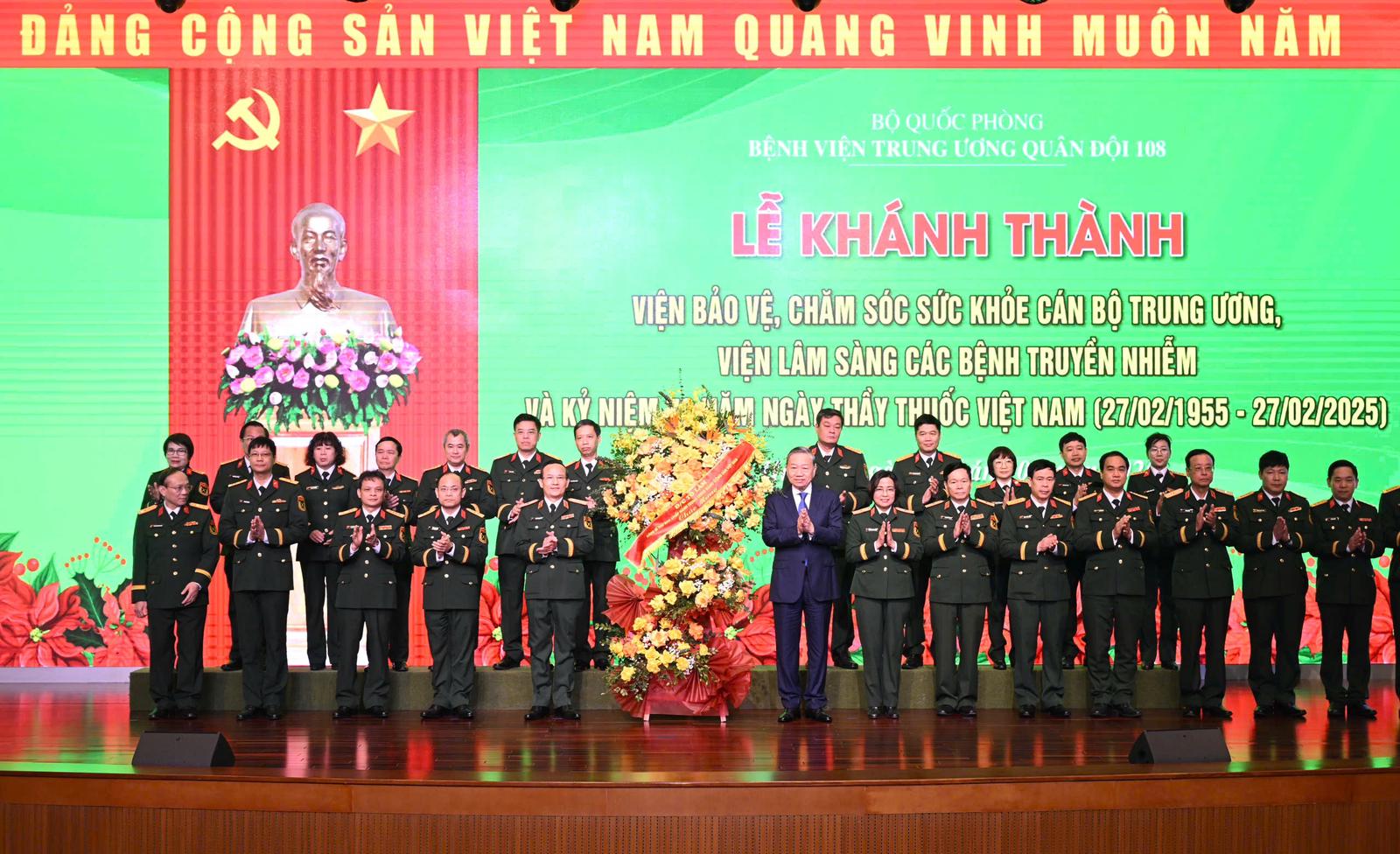 Tổng Bí thư Tô Lâm chúc mừng Bệnh viện Trung ương Quân đội 108 nhân kỷ niệm 70 năm Ngày Thầy thuốc Việt Nam (27/2/1955 - 27/2/2025). Ảnh: Bệnh viện Trung ương Quân đội 108