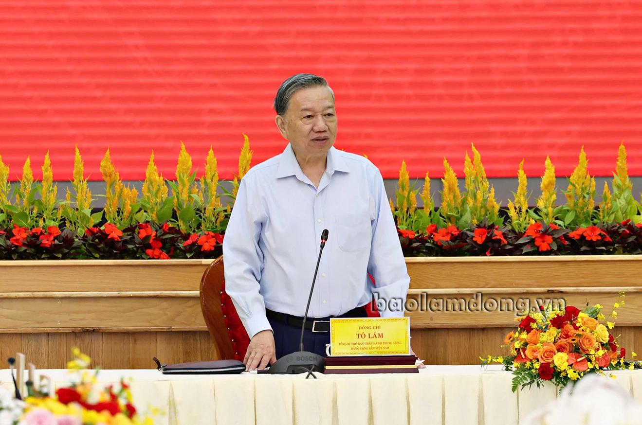 Sau khi nghe các báo cáo và ý kiến của các đại biểu tham dự, kết luận buổi làm việc, Tổng Bí thư Tô Lâm khẳng định: Lâm Đồng, Bình Thuận và Đắk Nông là những vùng đất giàu truyền thống cách mạng, đậm đà bản sắc dân tộc, đang nỗ lực phát triển, đổi mới toàn diện và khẳng định vị trí ngày càng quan trọng trong không gian phát triển kinh tế - xã hội của khu vực miền Trung - Tây Nguyên. Mỗi địa phương đều mang trong mình những bản sắc riêng, một thế mạnh nổi trội, góp phần làm nên không gian phát triển phong phú, đa chiều và giàu tiềm năng.
