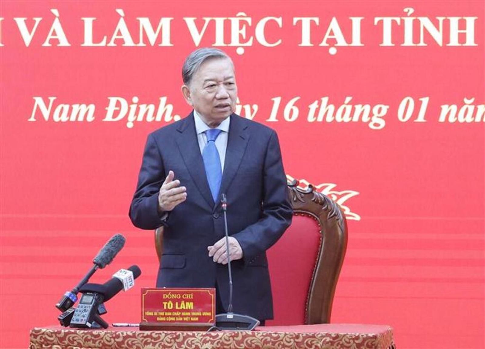 Phát biểu tại buổi làm việc, Tổng Bí thư Tô Lâm bày tỏ vui mừng tới thăm và làm việc với tỉnh Nam Định - vùng đất địa linh nhân kiệt, giàu truyền thống hiếu học, lịch sử yêu nước và cách mạng, nơi phát tích của Vương triều Trần, vương triều thịnh vượng của đất nước, quê hương của nhiều đồng chí lãnh đạo xuất sắc của Đảng và Nhà nước ta.