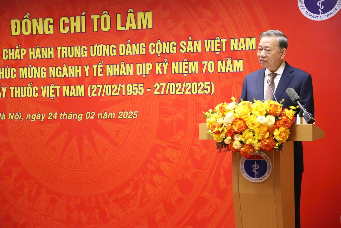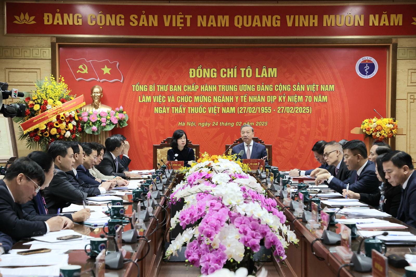 Phát biểu chỉ đạo tại buổi làm việc, Tổng Bí thư Tô Lâm nhấn mạnh, trải qua chặng đường 70 năm xây dựng, lao động, cống hiến và trưởng thành, ngành Y tế Việt Nam đã có những bước tiến vượt bậc cả về số lượng và chất lượng, đáp ứng nhu cầu ngày một cao hơn về chăm sóc y tế, khám chữa bệnh cho người dân.