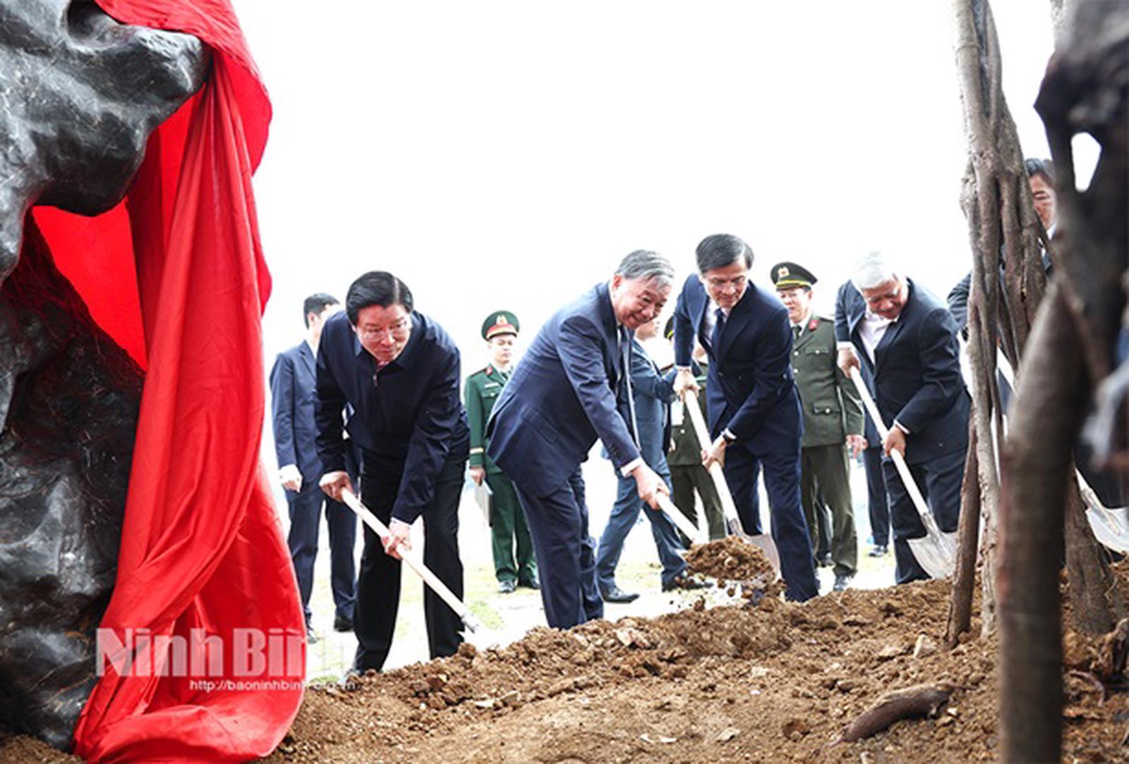 Tổng Bí thư Tô Lâm và các đại biểu trồng cây tại Quảng trường Đinh Tiên Hoàng Đế (thành phố Hoa Lư). Ảnh: BNB.