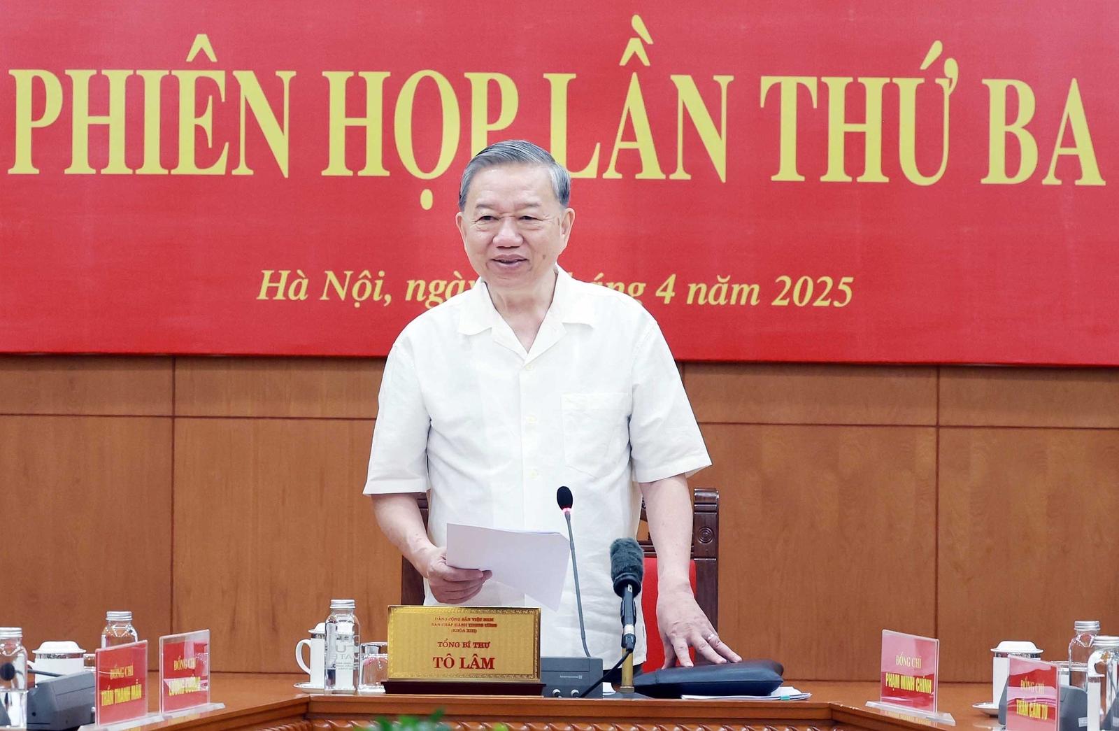 Ban Chỉ đạo Trung ương về tổng kết việc thực hiện Nghị quyết số 18 ngày 25/10/2017 của Ban Chấp hành Trung ương Đảng khóa XII “Một số vấn đề về tiếp tục đổi mới, sắp xếp tổ chức bộ máy của hệ thống chính trị tinh gọn, hoạt động hiệu lực, hiệu quả” (Ban Chỉ đạo) tổ chức Phiên họp lần thứ 3, với sự chủ trì của Tổng Bí thư Tô Lâm. Ảnh: TTXVN