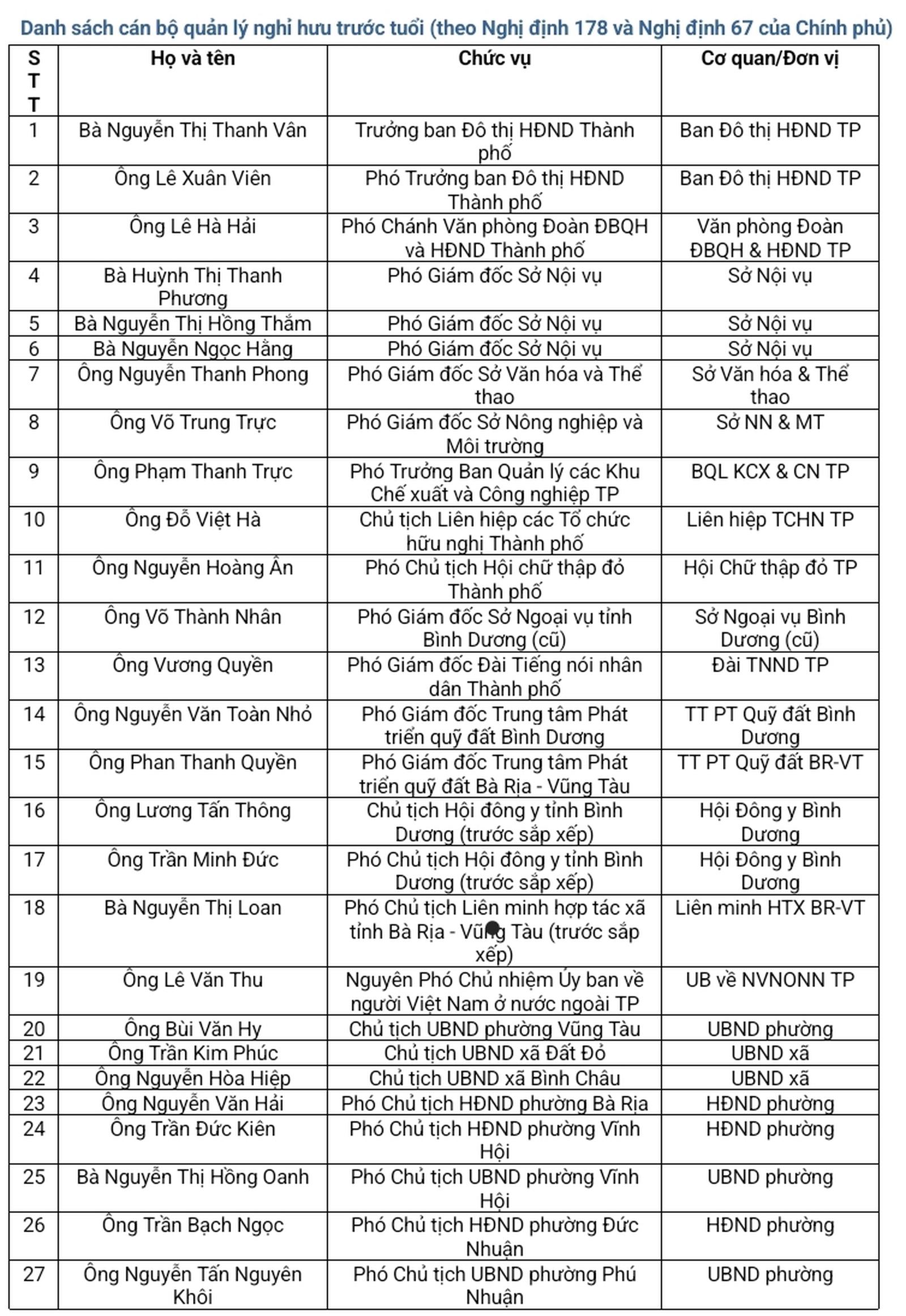 Danh sách 27 cán bộ quản lý nghỉ theo chế độ 178. Ảnh: Minh Nghĩa