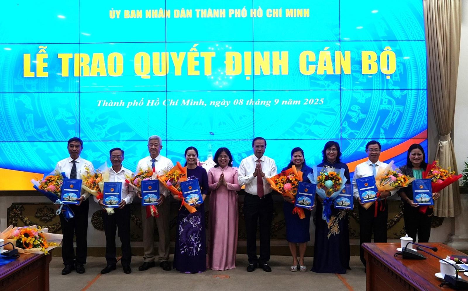Lãnh đạo UBND TP HCM trao Quyết định nghỉ chế độ cho 27 cán bộ quản lý thuộc các cơ quan, sở, ngành TP. Ảnh: CTT