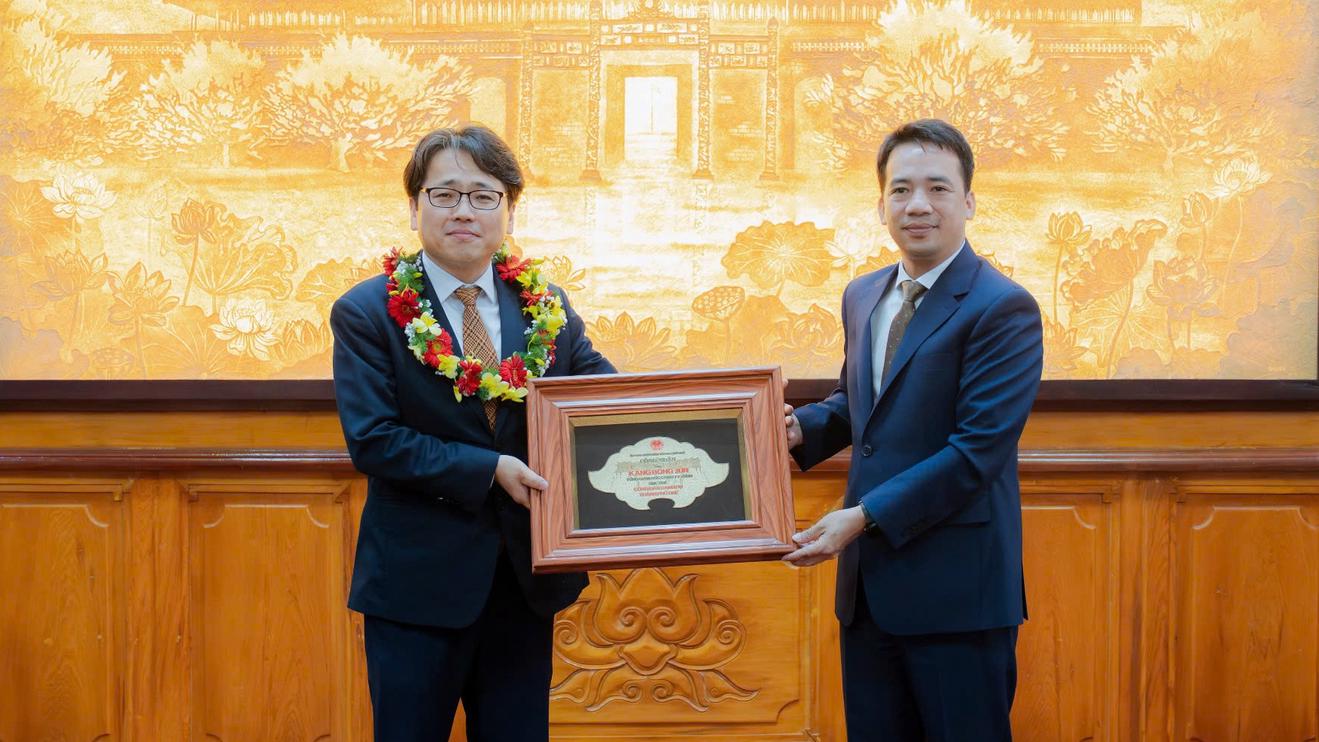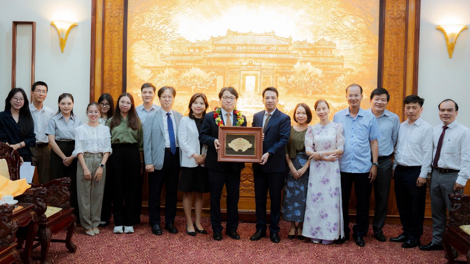 Lãnh đạo TP Huế chụp ảnh lưu niệm cùng ông Kang Bong Jun. Ảnh: HL