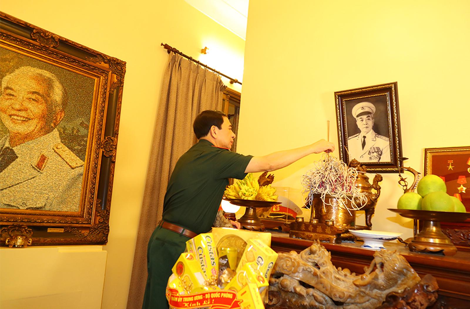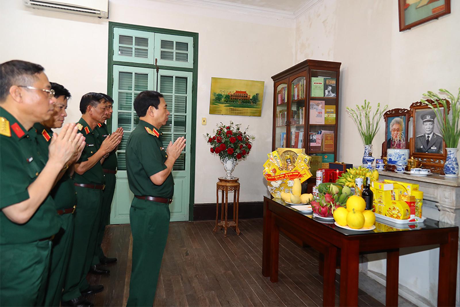 Trong không khí trang nghiêm và thành kính, Đại tướng Phan Văn Giang và các đồng chí trong Đoàn đã dâng hoa, dâng hương tưởng nhớ tại gia đình các lãnh đạo: Thượng tướng Lê Khả Phiêu, nguyên Tổng Bí thư và nguyên Chủ nhiệm Tổng cục Chính trị Quân đội Nhân dân Việt Nam; Đại tướng Lê Đức Anh, nguyên Ủy viên Bộ Chính trị, nguyên Chủ tịch nước và nguyên Bộ trưởng Bộ Quốc phòng; Đại tướng Võ Nguyên Giáp, nguyên Ủy viên Bộ Chính trị, nguyên Phó Chủ tịch Hội đồng Bộ trưởng và nguyên Bộ trưởng Bộ Quốc phòng; Đại tướng Chu Huy Mân, nguyên Ủy viên Bộ Chính trị, nguyên Phó Chủ tịch Hội đồng Nhà nước và nguyên Chủ nhiệm Tổng cục Chính trị Quân đội Nhân dân Việt Nam.