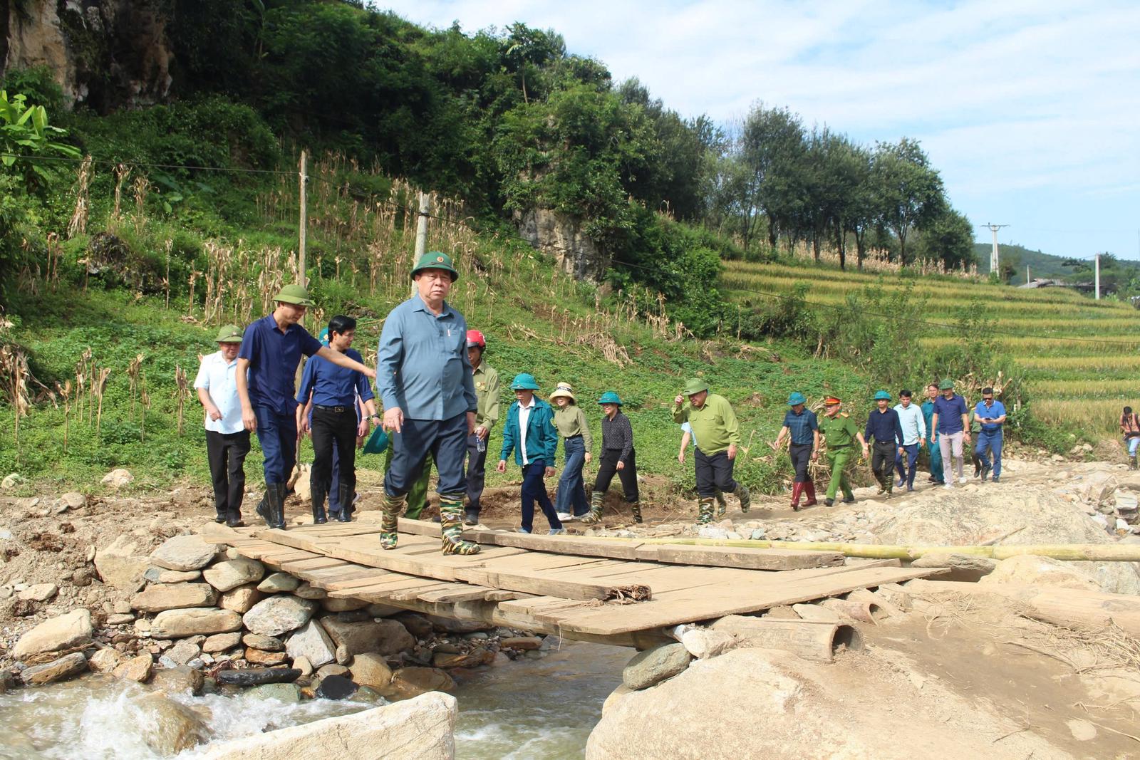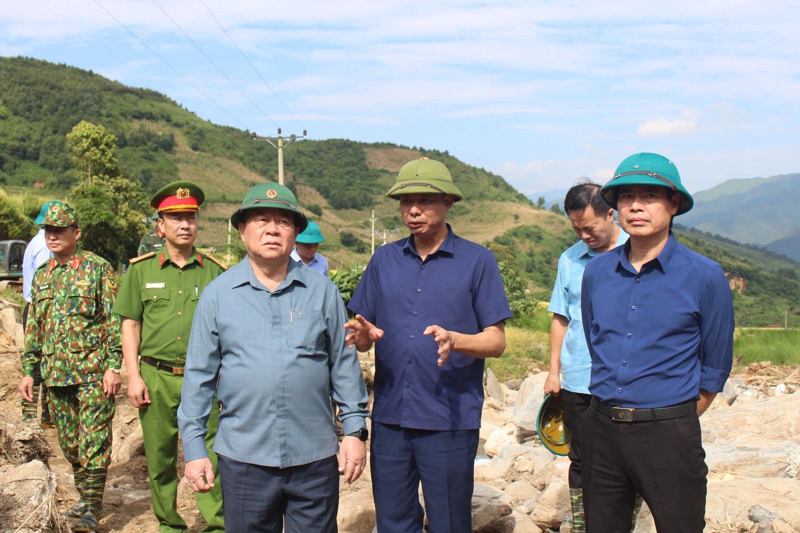 Đồng chí Nguyễn Trọng Nghĩa kiểm tra công tác khắc phục bão lũ tại xã Ngọc Chiến. Ảnh: TK