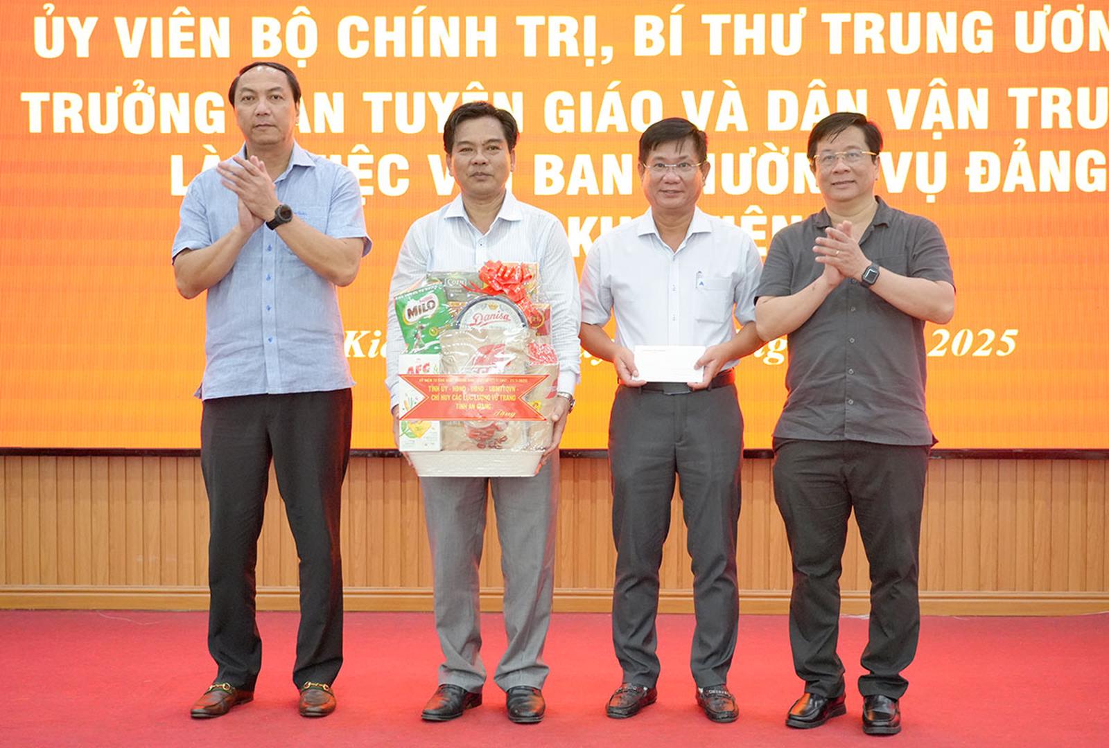 Phó Bí thư Tỉnh ủy, Chủ tịch UBND tỉnh An Giang Hồ Văn Mừng (phải) và Phó Bí thư Tỉnh ủy Lâm Minh Thành tặng quà cho Đảng ủy, UBND đặc khu Kiên Hải. Ảnh: Tây Hồ/AGO