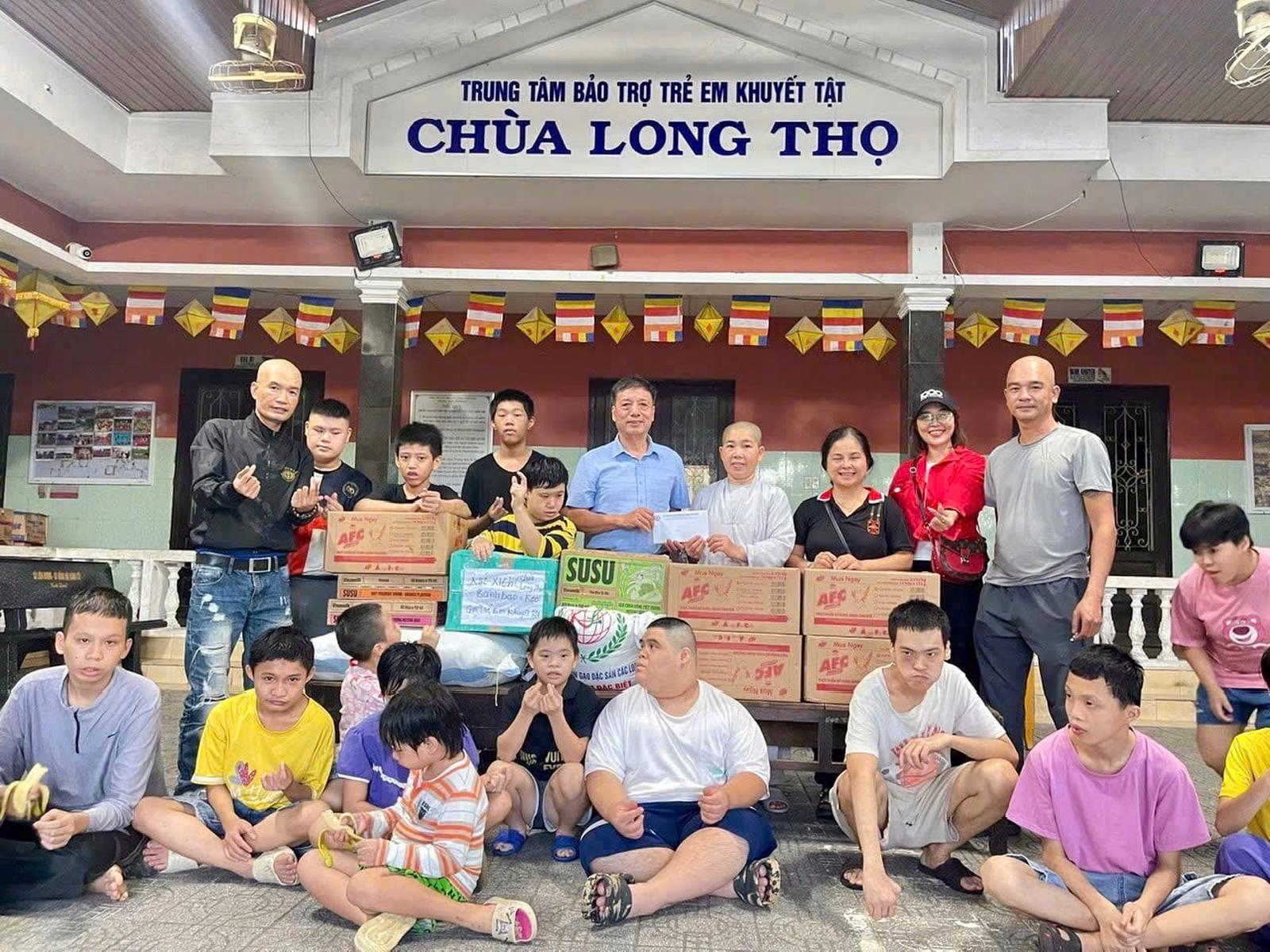 Thể hiện sự quan tâm của Đảng đối với các hoàn cảnh yếu thế, ông Bùi Văn Tuấn (đứng giữa) cùng các nhà hảo tâm trao quà, động viên trẻ em khuyết tật tại Trung tâm Bảo trợ trẻ em khuyết tật chùa Long Thọ, lan tỏa tinh thần nhân ái và trách nhiệm xã hội. Ảnh: Nhân vật cung cấp.