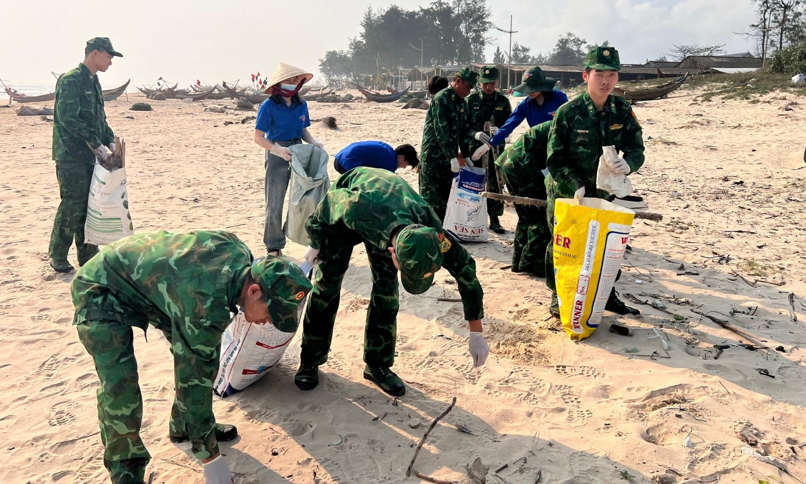 Chi đoàn Đồn Biên phòng Hải An phối hợp với Chi đoàn Trường Tiểu học và Trung học cơ sở Hải An làm sạch bờ biển hưởng ứng "Ngày Chủ nhật xanh" và "Tình nguyện chung tay xây dựng nông thôn mới". Ảnh: Minh Tân