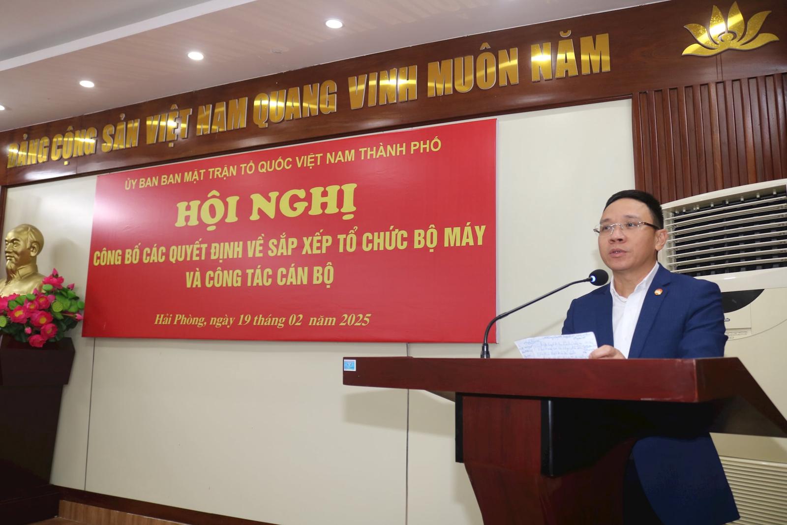 Phát biểu tại hội nghị, Chủ tịch UBMTTQ Việt Nam thành phố Hải Phòng Đào Trọng Đức cho biết: Đây là cơ quan đầu tiên của thành phố Hải Phòng công bố các quyết định liên quan đến sắp xếp, tinh gọn bộ máy. Việc thực hiện sắp xếp, tinh gọn bộ máy tại UBMTTQ Việt Nam thành phố Hải Phòng thực hiện theo Thông báo kết luận số 2557-TB/TU ngày 6/2/2025 của Ban Thường vụ Thành uỷ Hải Phòng về phương án sắp xếp, tinh gọn bộ máy các cơ quan chuyên trách, tham mưu, giúp việc, đơn vị sự nghiệp trực thuộc Thành uỷ.