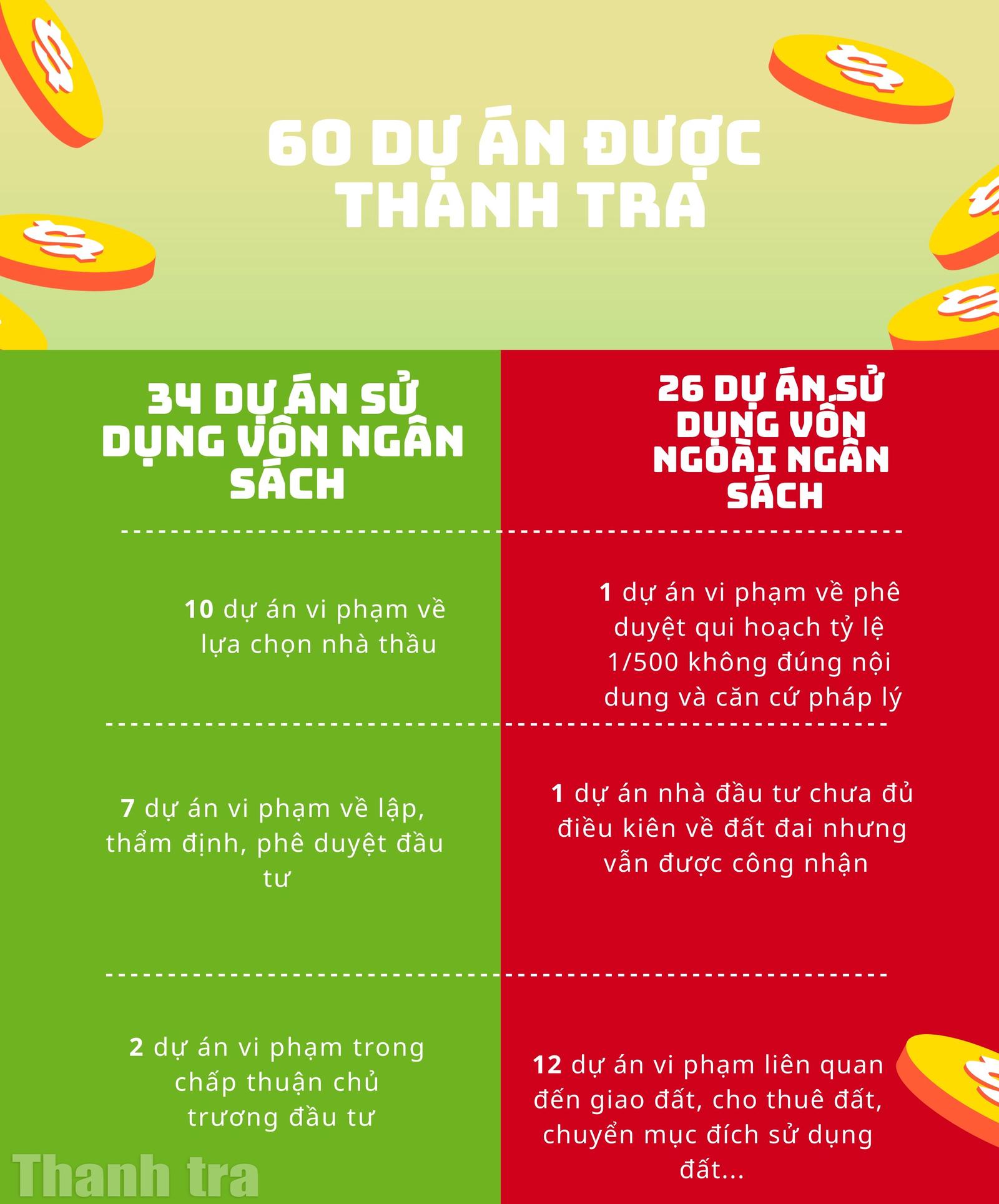 Qua thanh tra 60 công trình, dự án trong đó có 34 dự án sử dụng vốn ngân sách và 26 dự án sử dụng vốn ngoài ngân sách đã phát hiện các hạn chế, thiếu sót.