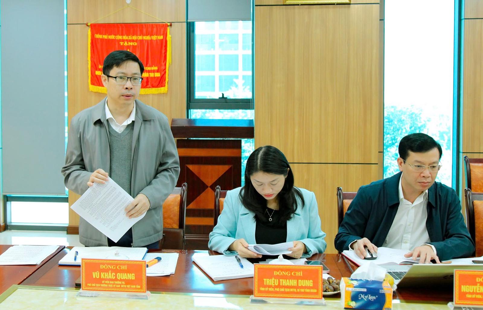 Phó Chủ tịch Thường trực Ủy ban MTTQ tỉnh Cao Bằng Vũ Khắc Quang phát biểu tại buổi làm việc. Ảnh: Nguyệt Hà - Bế Gia
