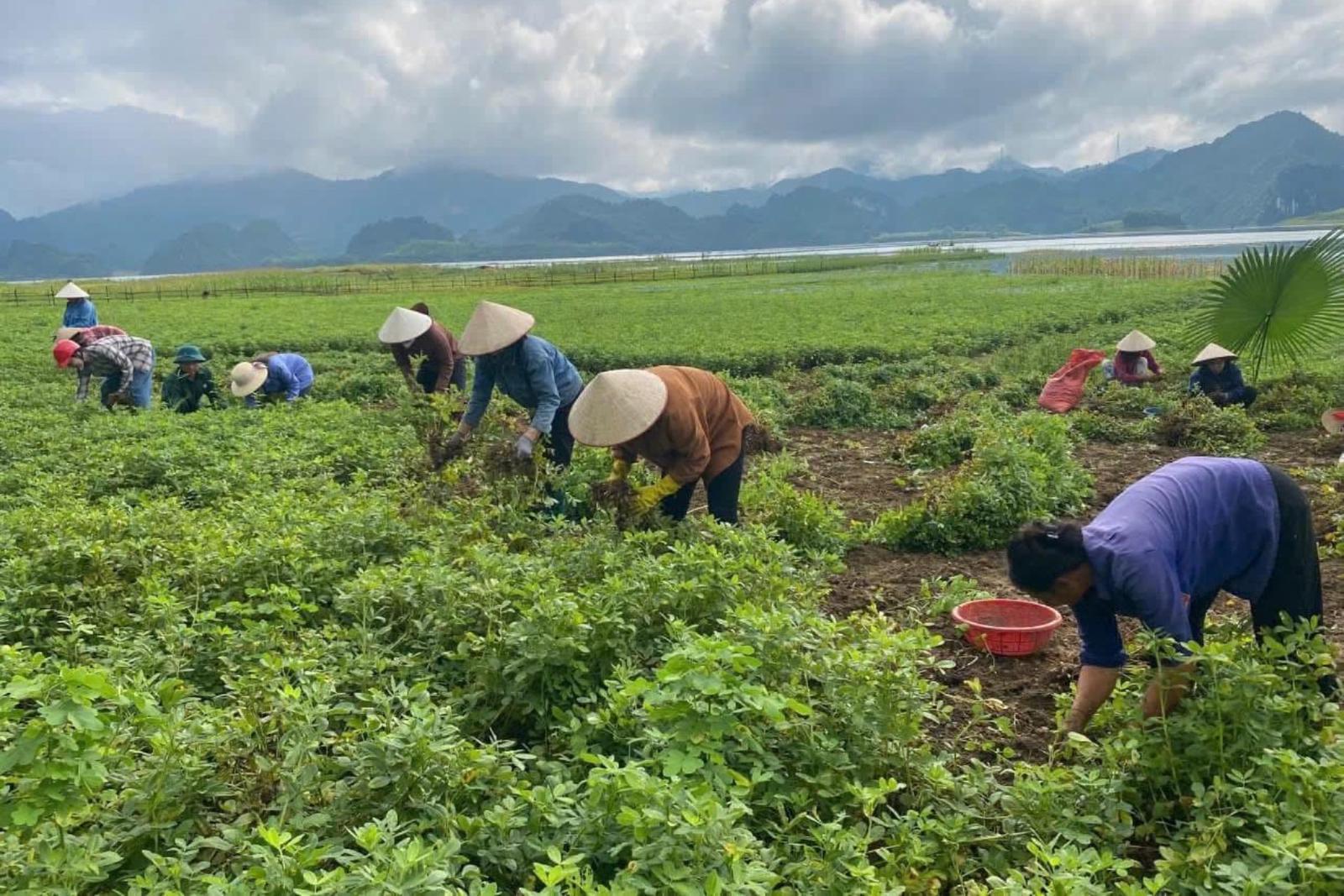 Trước tình trạng mưa lớn kéo dài, Uỷ ban Mặt trận Tổ quốc và các đoàn thể xã Mường Lai xuống đồng hỗ trợ các hộ có hoàn cảnh khó khăn thu hoạch lạc, ngô, lúa kịp thời. Ảnh: Duy Khánh