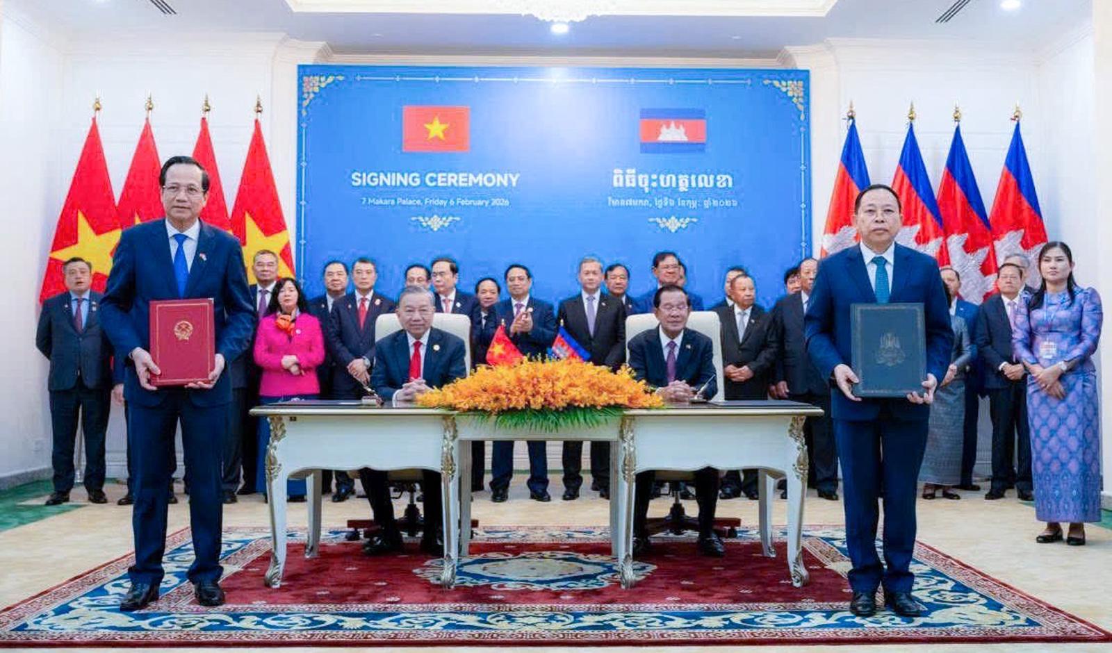 Tổng Bí thư Tô Lâm và Chủ tịch Đảng Nhân dân Campuchia Samdech Techo Hun Sen chứng kiến Lễ ký kết thỏa thuận hợp tác song phương giữa Bộ Dân tộc và Tôn giáo Việt Nam và Bộ Lễ nghi và Tôn giáo Campuchia.