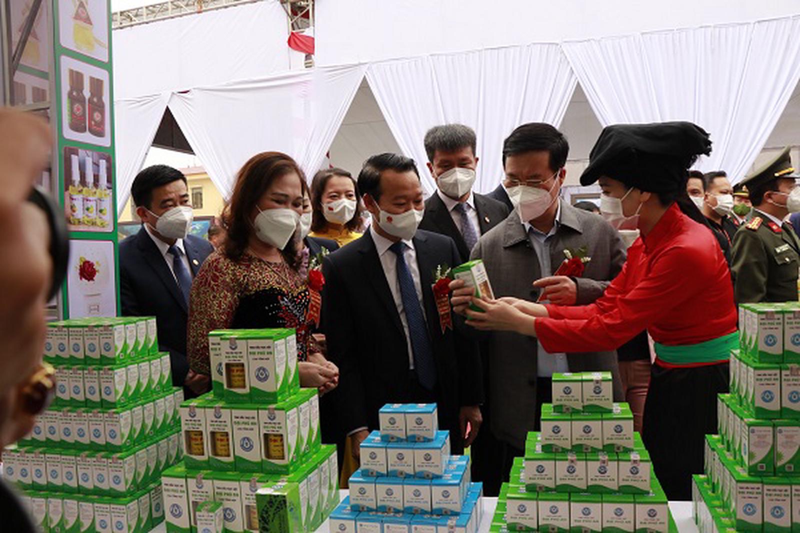 Dịp này, Thường trực Ban Bí thư Võ Văn Thưởng cùng đoàn công tác của Trung ương, các đồng chí lãnh đạo tỉnh Yên Bái đã tham quan các gian trưng bày sản phẩm nông nghiệp đặc sản, chủ lực của xã Tân Hợp và của huyện Văn Yên.