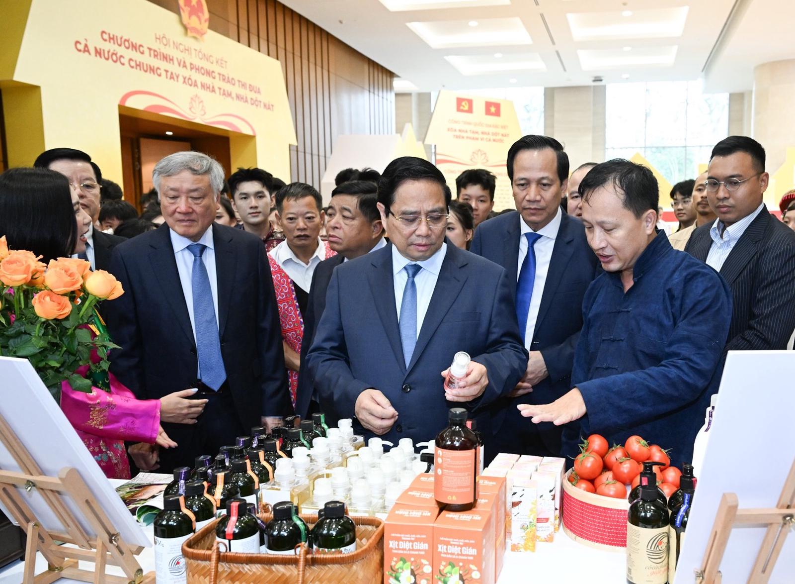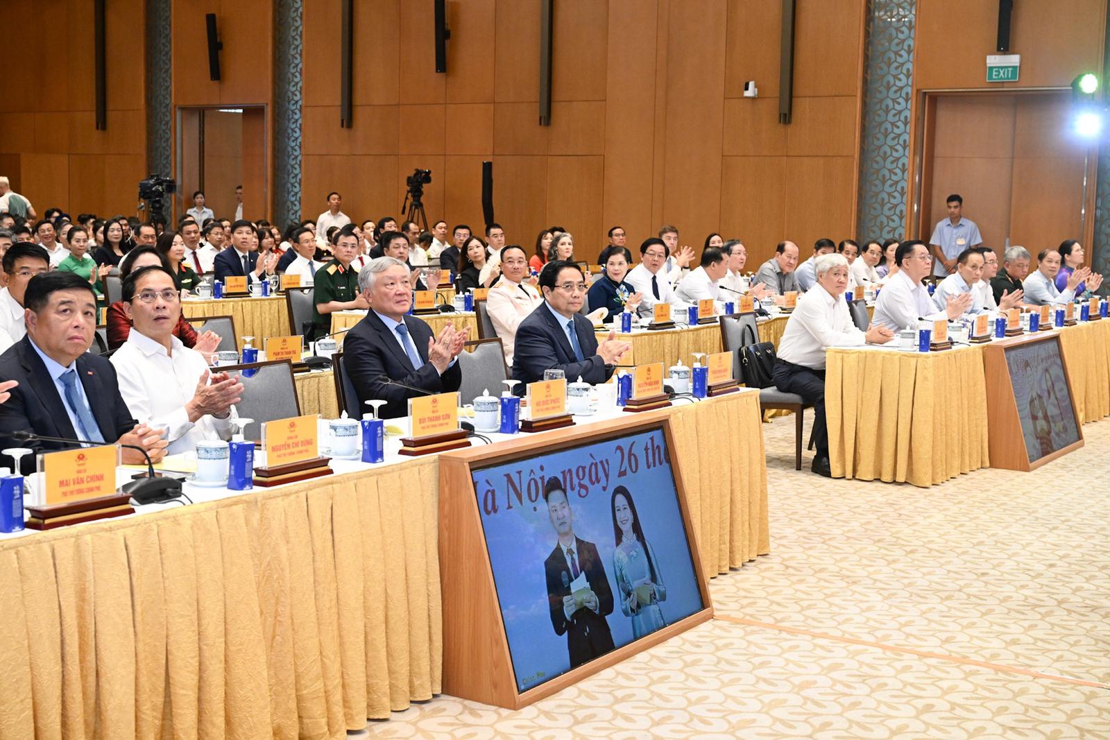 Thủ tướng Phạm Minh Chính và các đại biểu tham dự Hội nghị tổng kết chương trình và phong trào thi đua "Cả nước chung tay xóa nhà tạm, nhà dột nát”. Ảnh: T.Giang