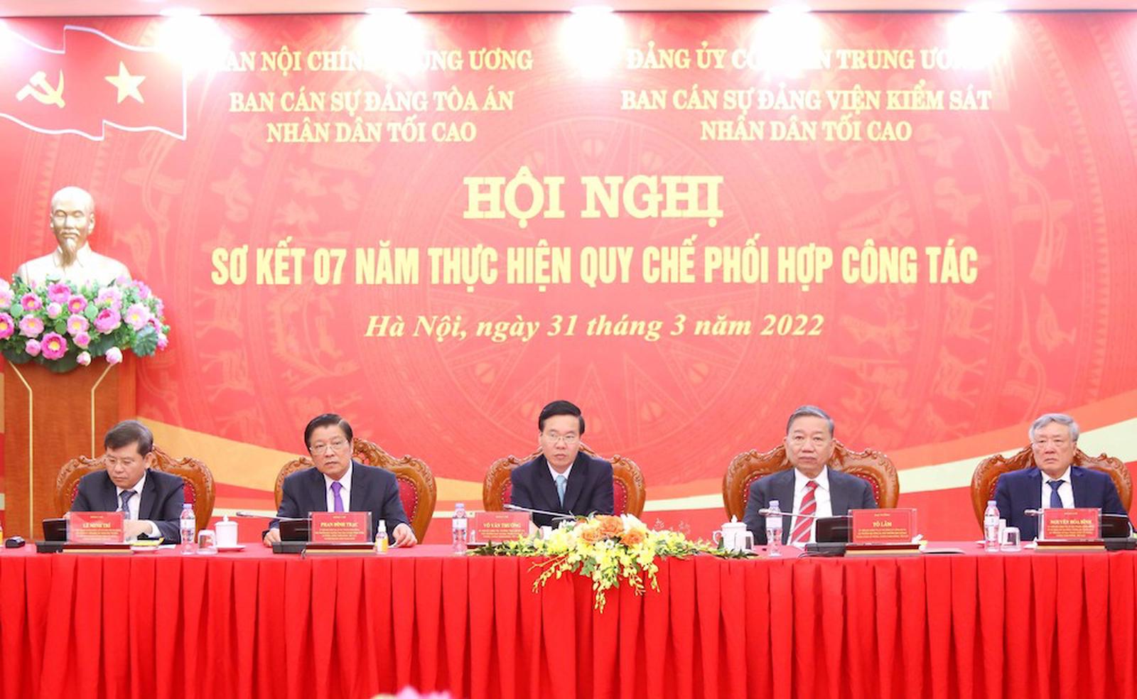 Phát biểu tại hội nghị, Thường trực Ban Bí thư Võ Văn Thưởng, Phó Trưởng ban Chỉ đạo Trung ương về phòng, chống tham nhũng, tiêu cực nhấn mạnh, các cơ quan trên đã rất trách nhiệm, phối hợp chặt chẽ, tham mưu có hiệu quả cho Đảng trong lãnh đạo, chỉ đạo xử lý các vụ việc, vụ án tham nhũng, kinh tế, đảm bảo kịp thời, nghiêm minh, đúng pháp luật, “không có vùng cấm, không có ngoại lệ, bất kể người đó là ai”.