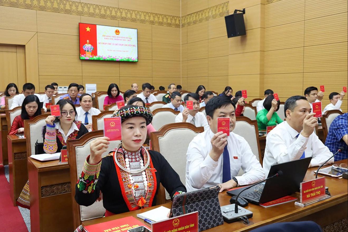 100% đại biểu HĐND tỉnh Yên Bái biểu quyết, nhất trí thông qua Nghị quyết về chủ trương sắp xếp ĐVHC cấp xã tỉnh Yên Bái và Nghị quyết về chủ trương sắp xếp, hợp nhất 2 tỉnh Yên Bái và Lào Cai thành tỉnh Lào Cai. Ảnh: Minh Huyền